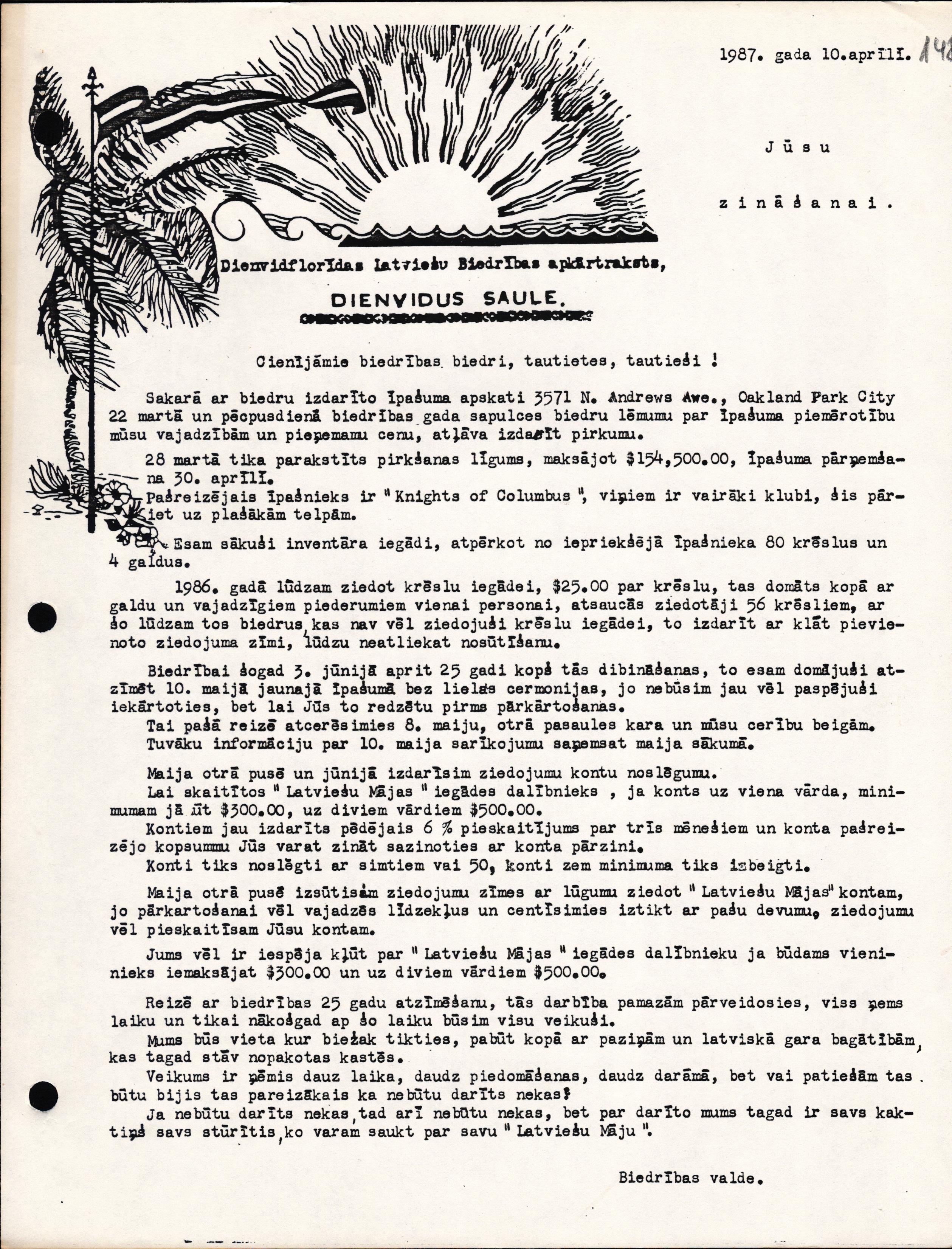 1978. gada 29. janvāra Dienvidfloridas Latviešu biedrības gada sapulcē tika pieņemts J. Plukša priekšlikums par latviešu kultūras centra “Latviešu Mājas" izveidošanu. Biedrības valde sapulcē nolēma vispirms uzkrāt līdzekļus īpašuma iegādei un atvēra “Latviešu Mājas” kontu ziedojumu vākšanai, par konta atbildīgo izvēloties J. Pluksi un viņa vietnieku Ludi Bērziņu. 1987. gada 11. maijā Dienvidfloridas Latviešu biedrība pārņēma katoļu labdarības organizācijas “Knight of Columbus” īpašumu, samaksājot par to 154,500 dolāru, kas tika sakrāti ziedojumu veidā. Ēka tika izremontēta un iekārtota. Lielu vērību biedrība veltīja grāmatu krātuvei, iekārtojot bibliotēku un lasītavu “Latviešu Mājas” telpās. Paralēli pārējiem darbiem J. Pluksis krājis grāmatas, lai biedrībai veidotu bibliotēku, un tās veidošanu viņš veicis patstāvīgi. Sarīkojumu telpā tika iebūvēta skatuve un iegādātas klavieres. Jaunajā ēkā notika dažādi pasākumi, svētku svinēšana, izstādes u.c. “Latviešu Mājas” izveidošana turpinājās līdz 1991. gadam, izveidojot nelielā dārzā piemiņas vietu kritušajiem un bojāgājušajiem latviešiem ar strūklaku, kuras lāses veidotas kā krītošas asaras. Piemiņas vietu un “Latviešu Māju” iesvētīja 1991. gada 17. martā. 2000. gada septembrī biedrības īpašums “Latviešu Māja” tika pārdots.