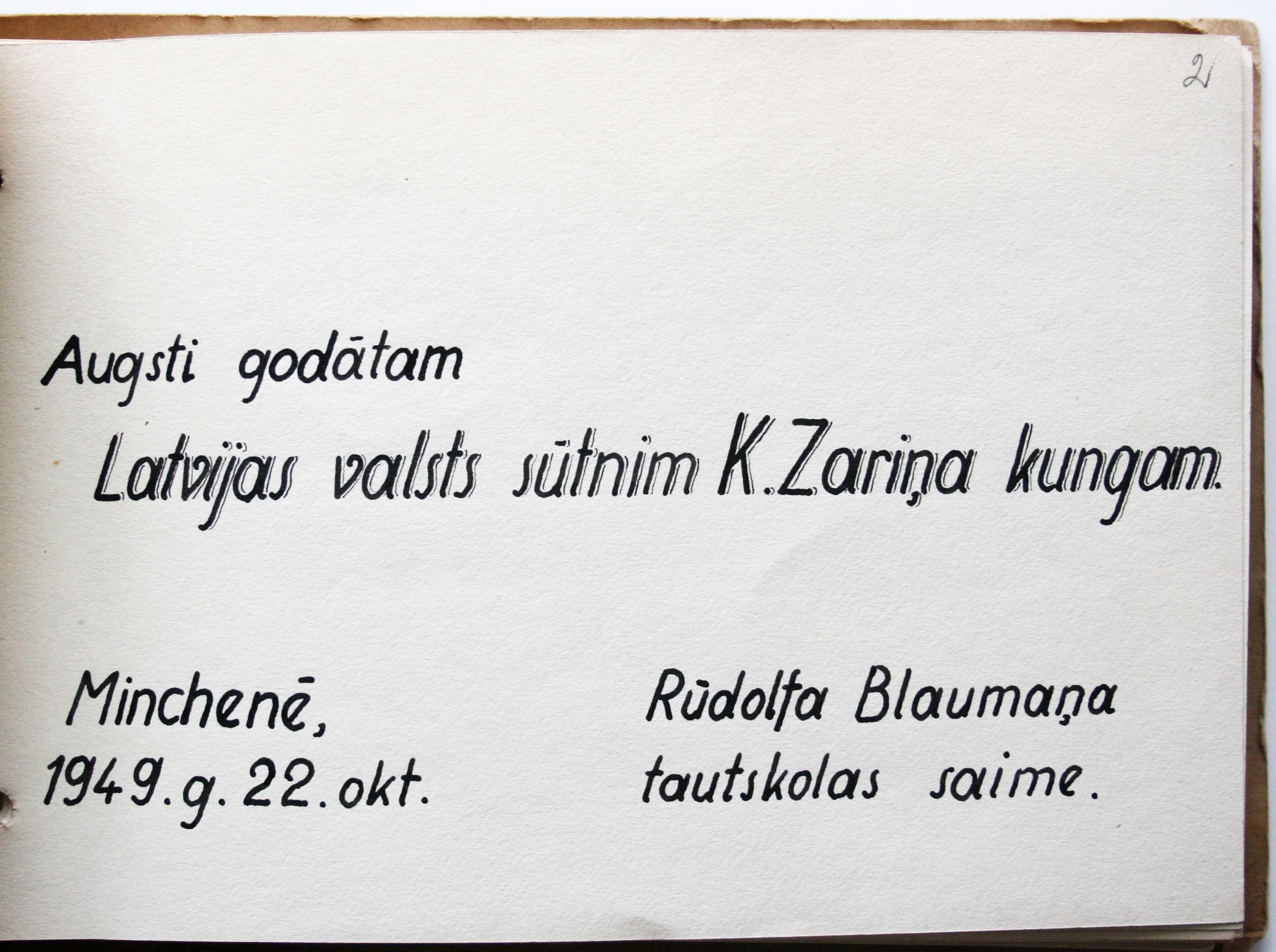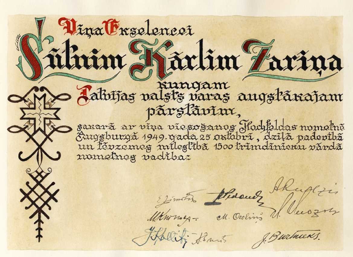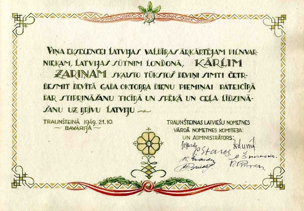 Latvijas sūtnim Lielbritānijā, ārkārtējo pilnvaru nesējam K. Zariņam pēc latviešu bēgļu nometņu Vācijā apmeklējuma 1949. gadā nometņu pārstāvji uzdāvināja 14 albumus ar melnbaltām fotogrāfijām un fotogrāfijās redzamo vietu, notikumu, cilvēku aprakstiem un anotācijām.