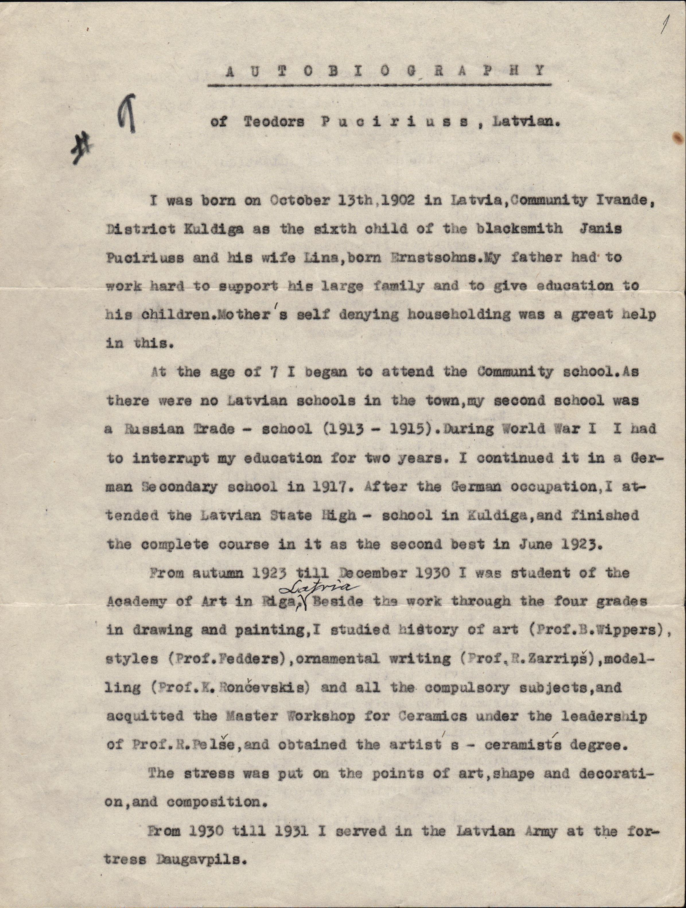 Keramiķis, pedagogs, tulkotājs un sabiedriskais darbinieks Teodors Puciriuss dzimis Kuldīgas apriņķa Īvandes pagastā. Mācījies Īvandē, Kuldīgā un 1930. gadā pabeidzis Latvijas Mākslas akadēmijas Rūdolfa Pelšes vadīto keramikas meistardarbnīcu ar diplomdarbu – strūklakas projektu “Gulbju jaunava”. Pēc tam no 1932. - 1944. gadam strādājis par zīmēšanas skolotāju Ludzas Valsts ģimnāzijā un arodskolā, veica arī Ludzas Valsts ģimnāzijas internāta audzinātāja, pedagogu padomes sekretāra pienākumus, vadījis Jaunatnes Sarkanā Krusta pulciņu un bijis arī skolas ambulances pārzinis. Paralēli darbam skolā viņš pievērsās dekoratīvu šķīvju un sīkplastikas darbu darināšanai, kuros bija izteikts figurālists. Tajos galvenokārt vērojamas latviskas tēmas.