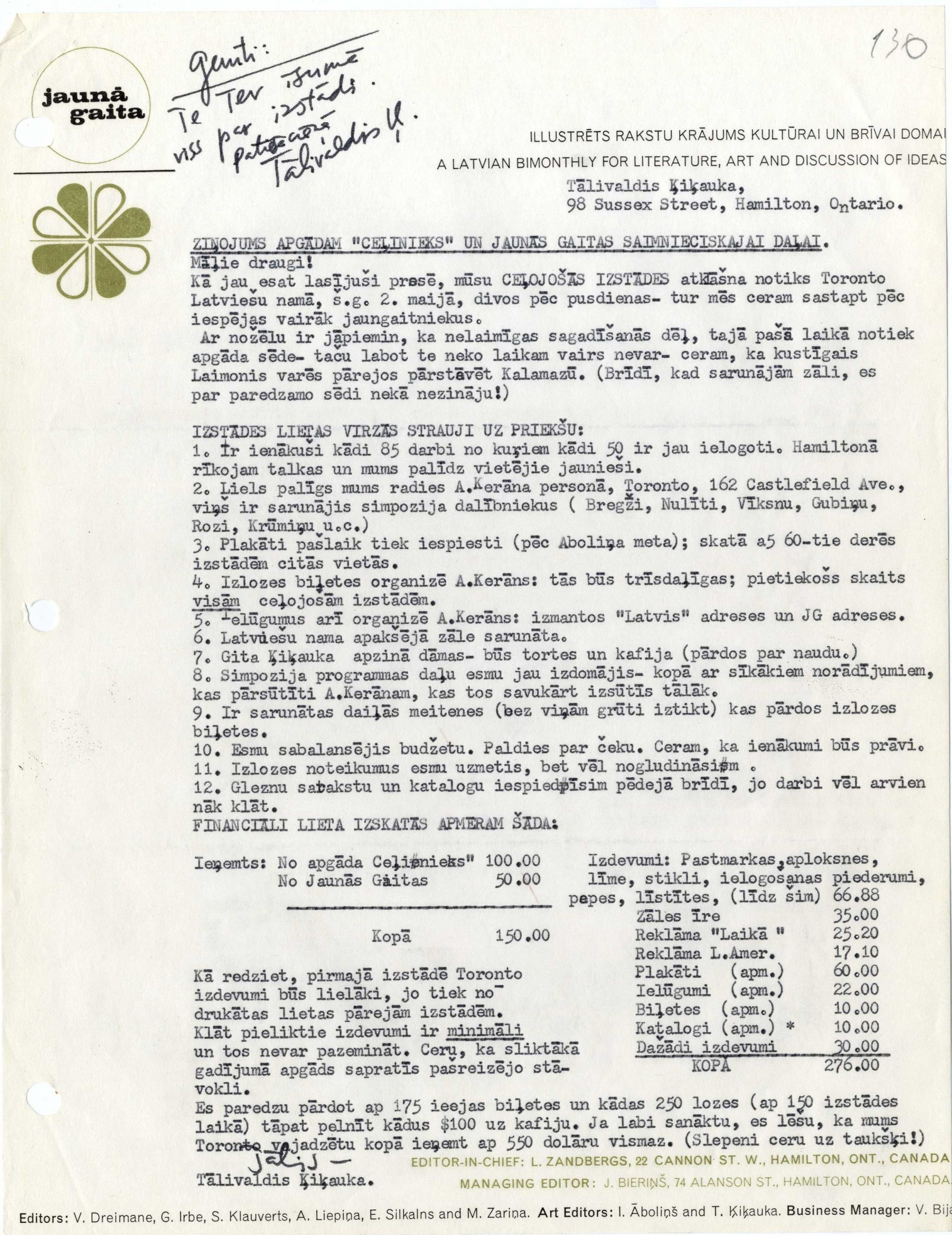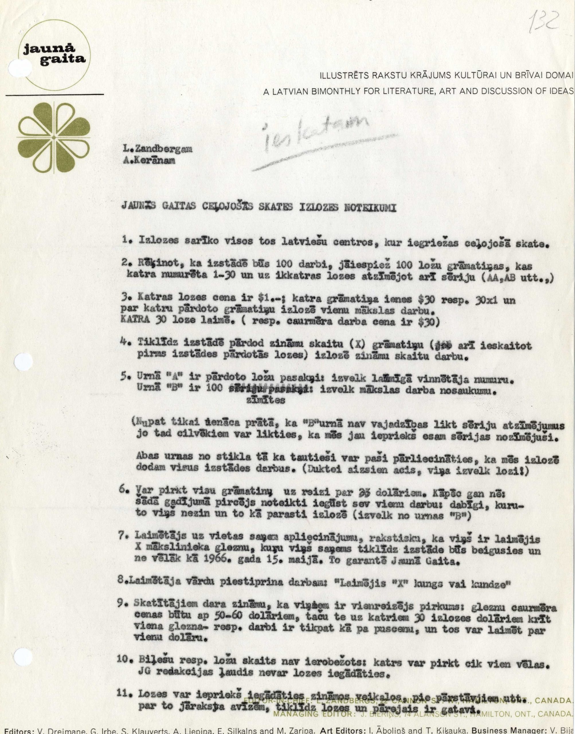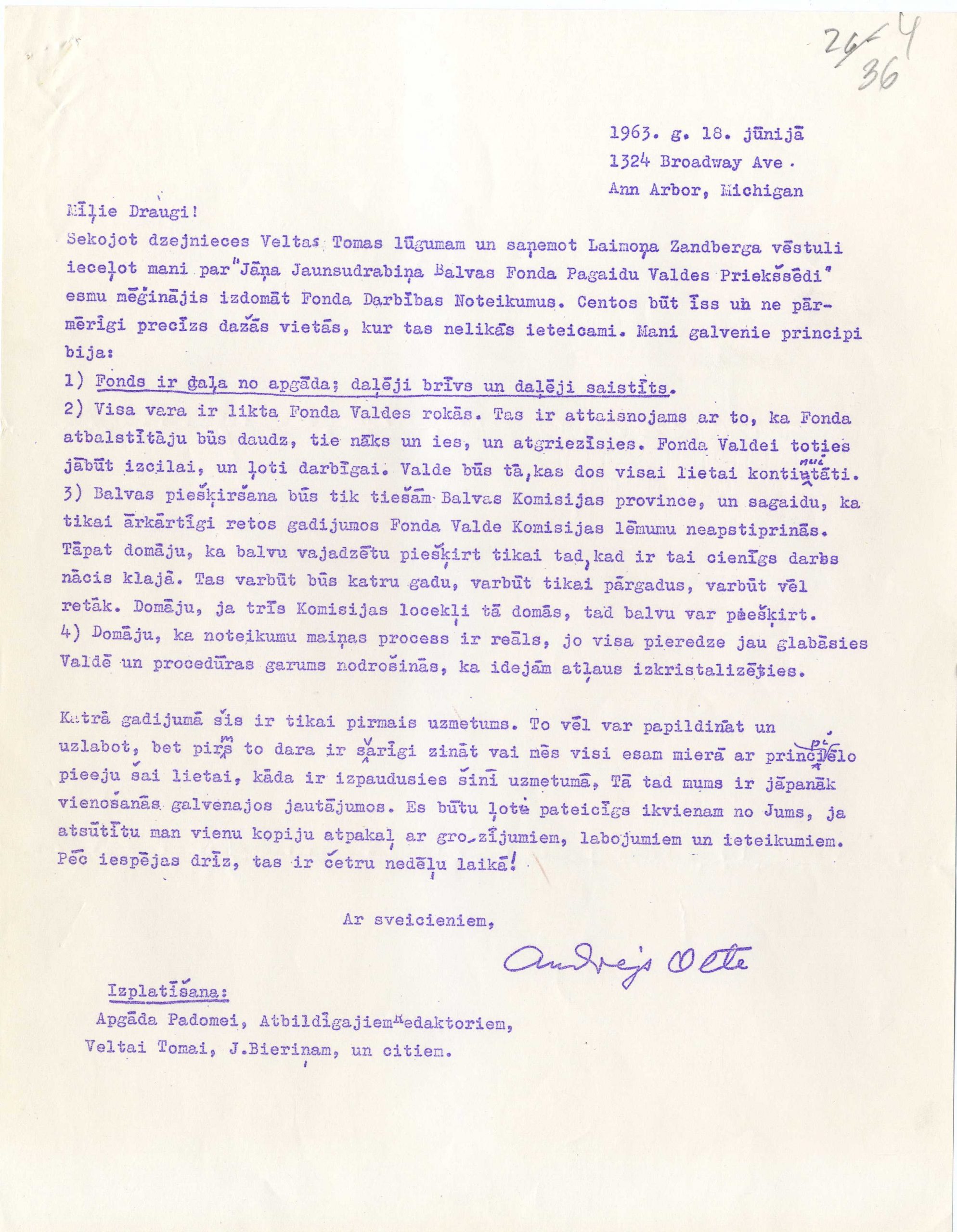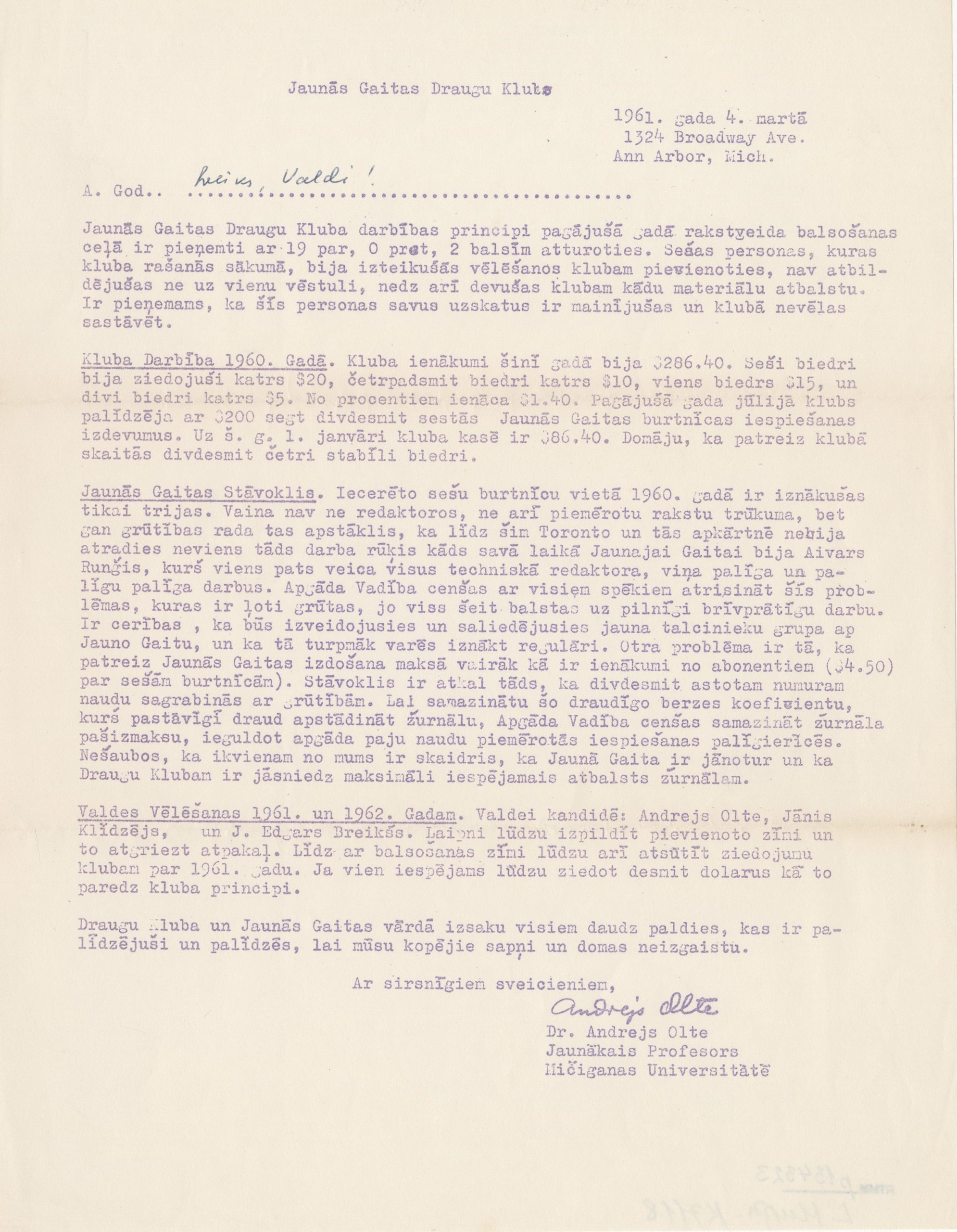 Jaunās Gaitas Draugu kluba biedra Andreja Oltes vēstule Valdim Muižniekam – paziņojums par jaunpieņemtajiem Jaunās Gaitas Draugu kluba darbības principiem, finansiālo stāvokli un valdi. 1961. gada 4. marts. Avots: Latvijas Rakstniecības un mūzikas muzeja krājums.