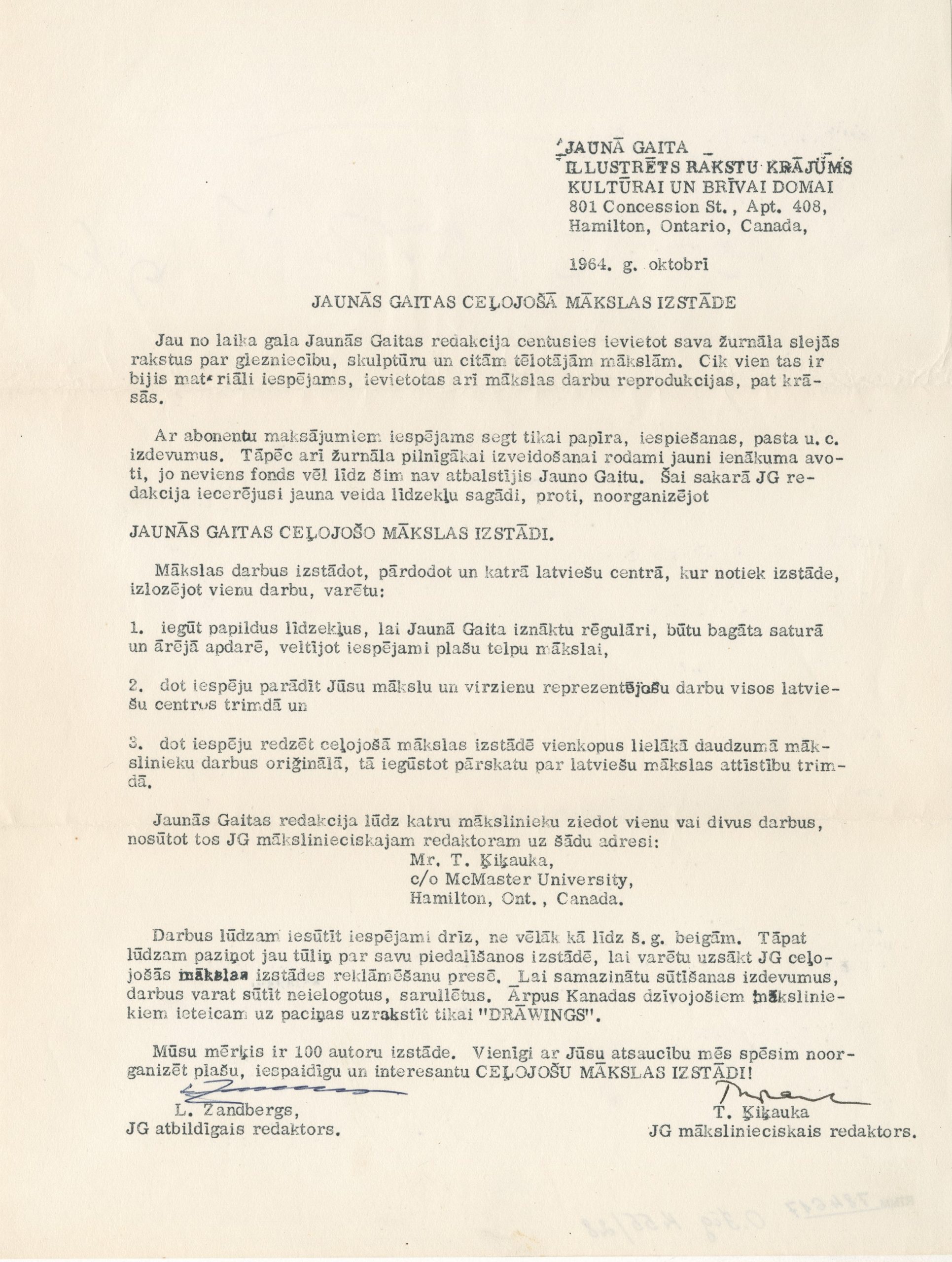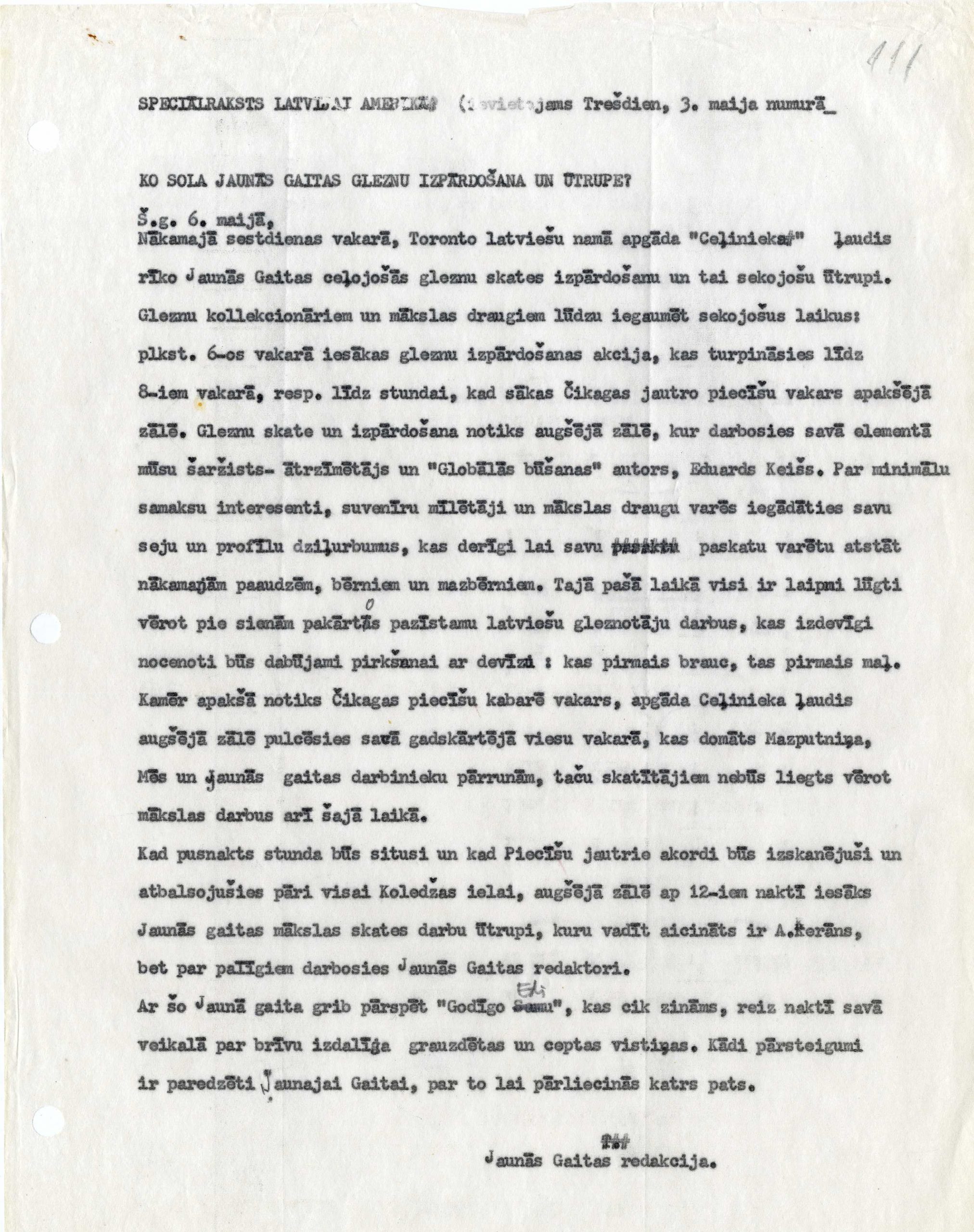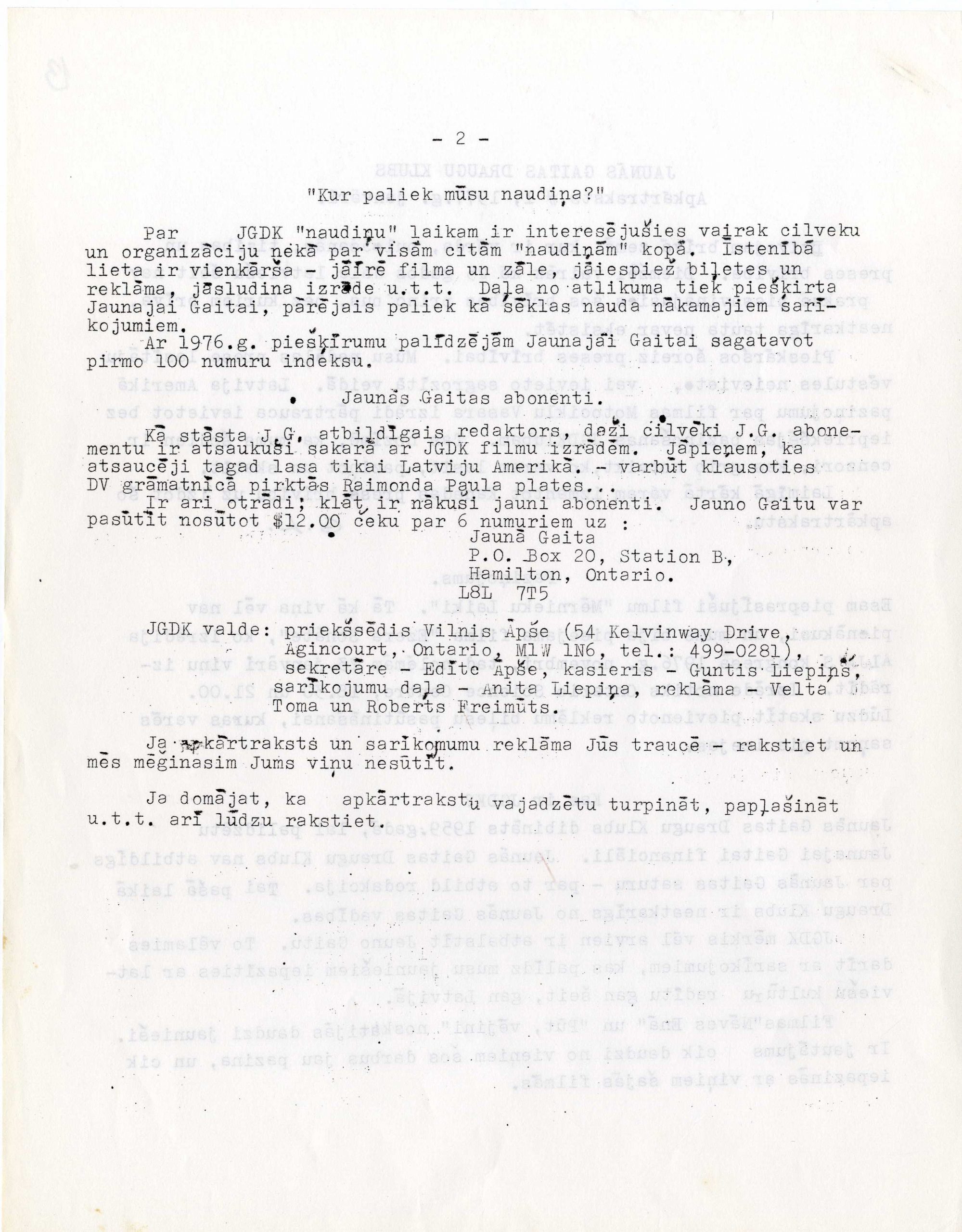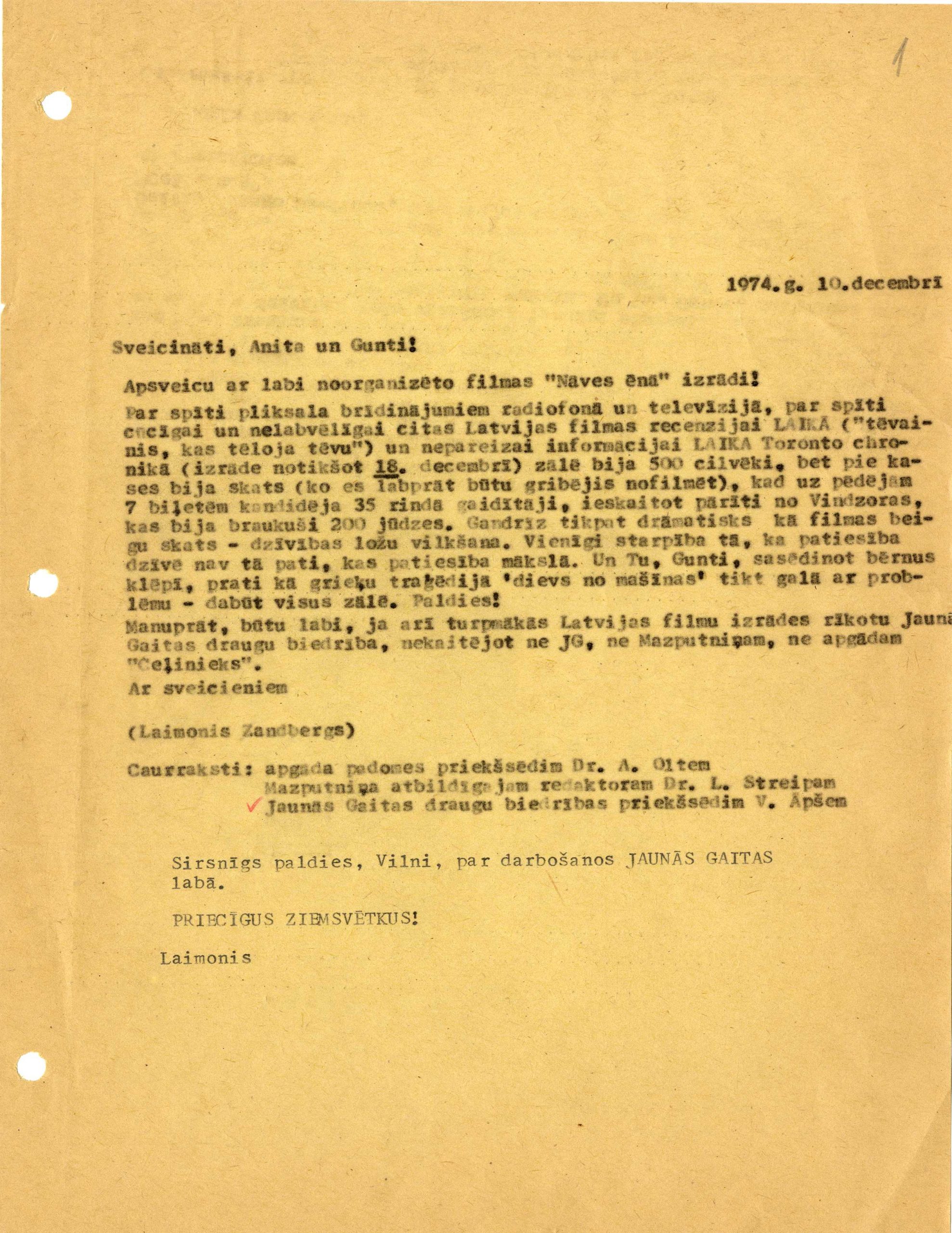 Jaunās Gaitas Draugu kluba biedra Andreja Oltes vēstule Valdim Muižniekam – paziņojums par jaunpieņemtajiem Jaunās Gaitas Draugu kluba darbības principiem, finansiālo stāvokli un valdi. 1961. gada 4. marts. Avots: Latvijas Rakstniecības un mūzikas muzeja krājums.