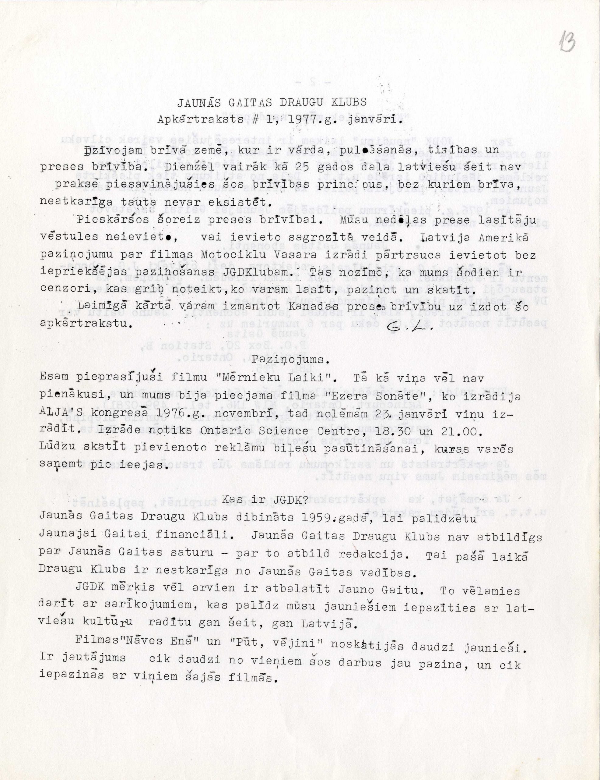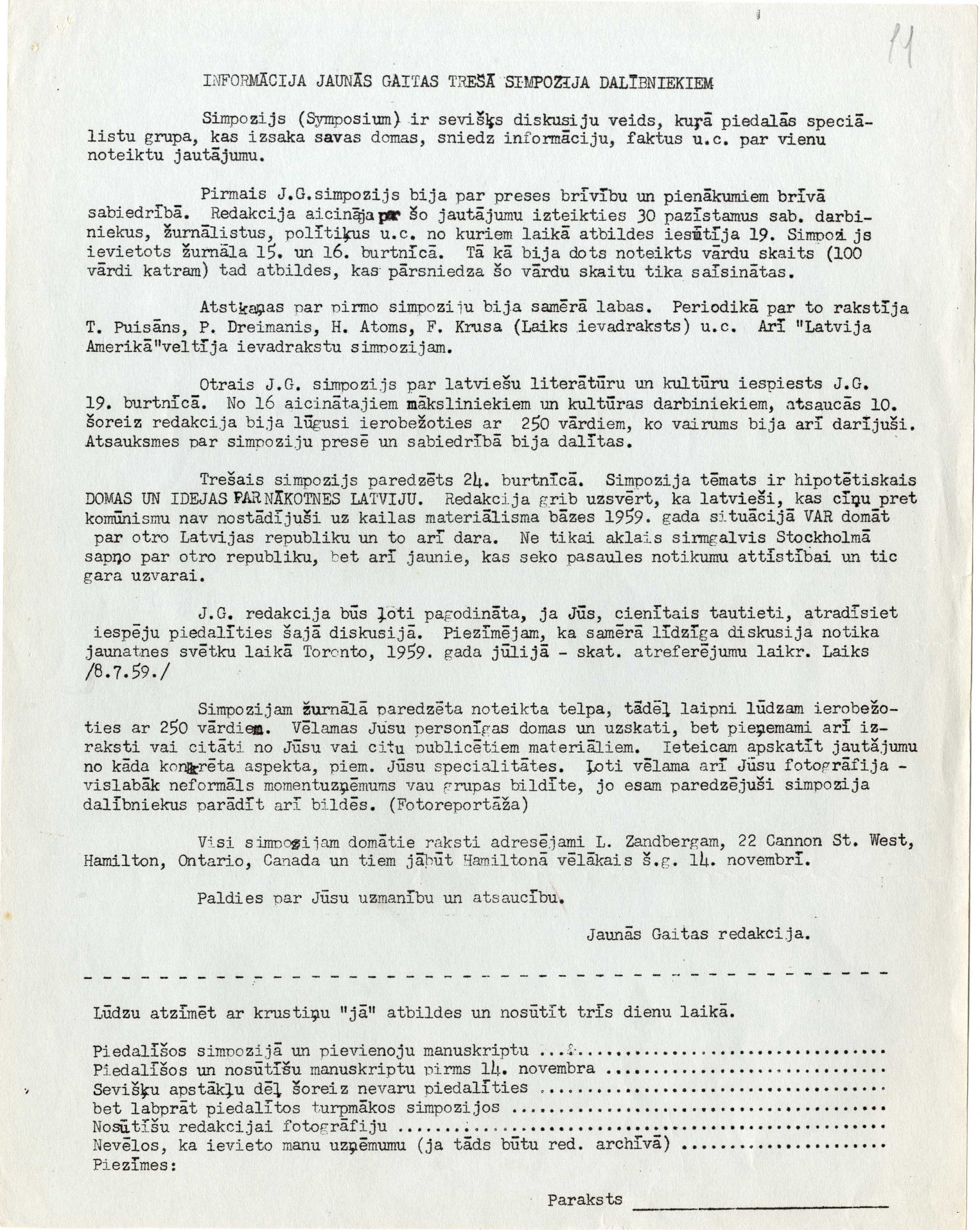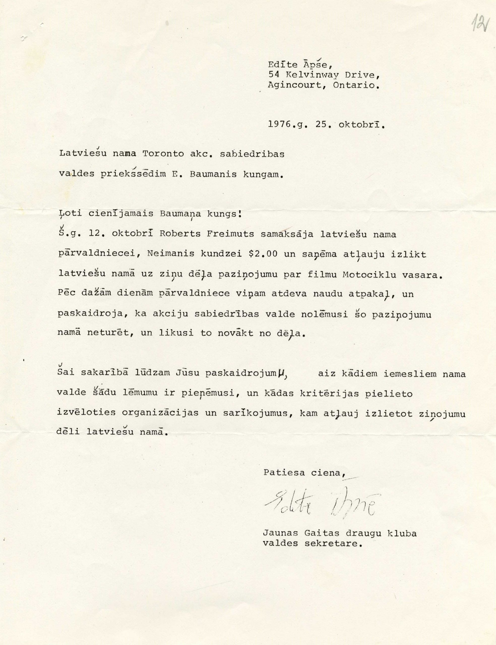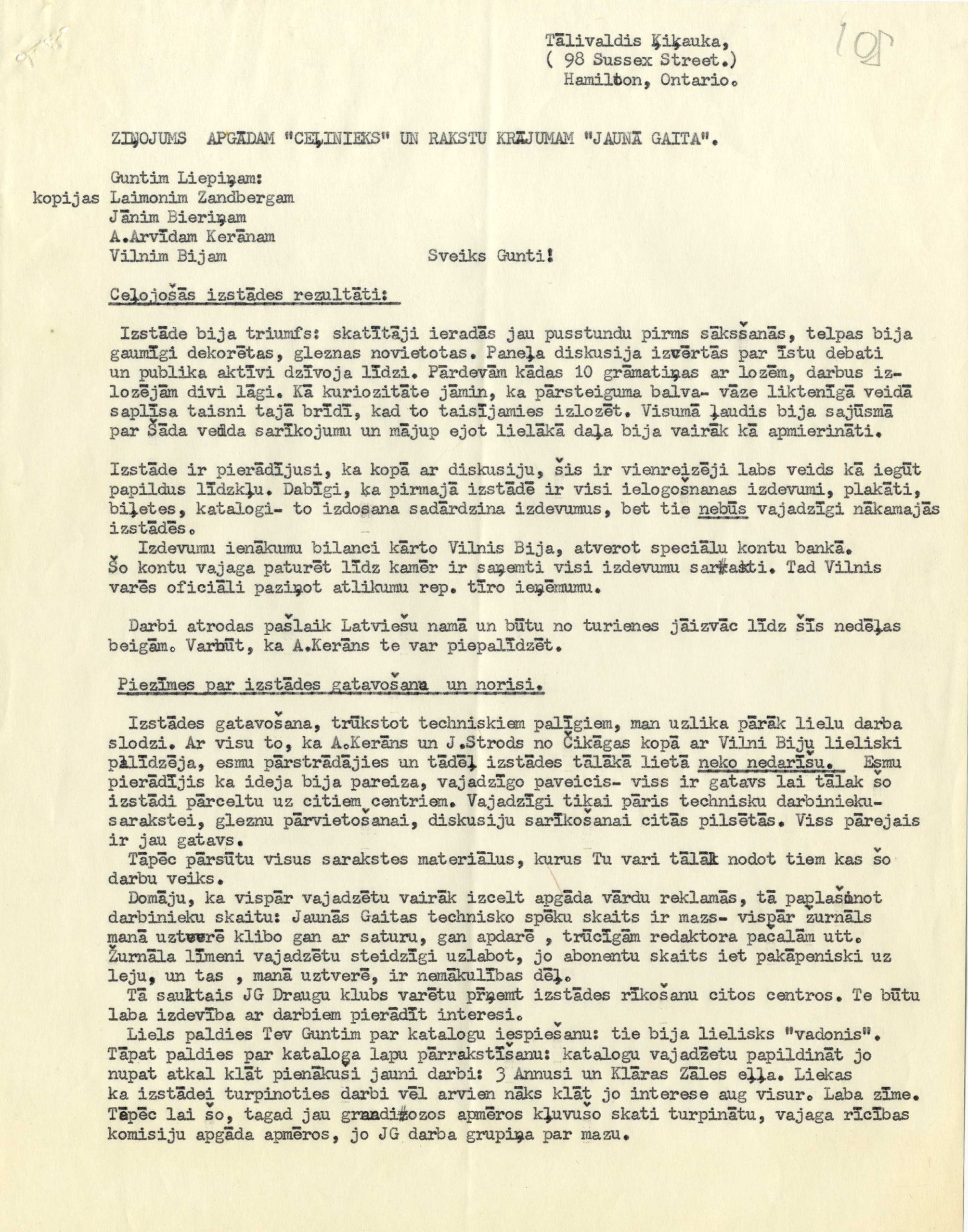 Jaunās Gaitas Draugu kluba biedra Andreja Oltes vēstule Valdim Muižniekam – paziņojums par jaunpieņemtajiem Jaunās Gaitas Draugu kluba darbības principiem, finansiālo stāvokli un valdi. 1961. gada 4. marts. Avots: Latvijas Rakstniecības un mūzikas muzeja krājums.