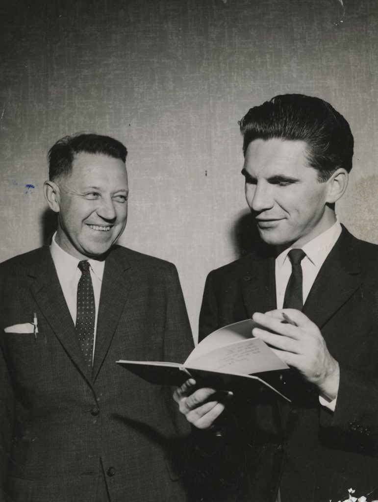 Foto: no kreisās: Jānis Bieriņš un Laimonis Zandbergs. E. Šulca foto. Avots: Latvijas Rakstniecības un mūzikas muzeja krājums.