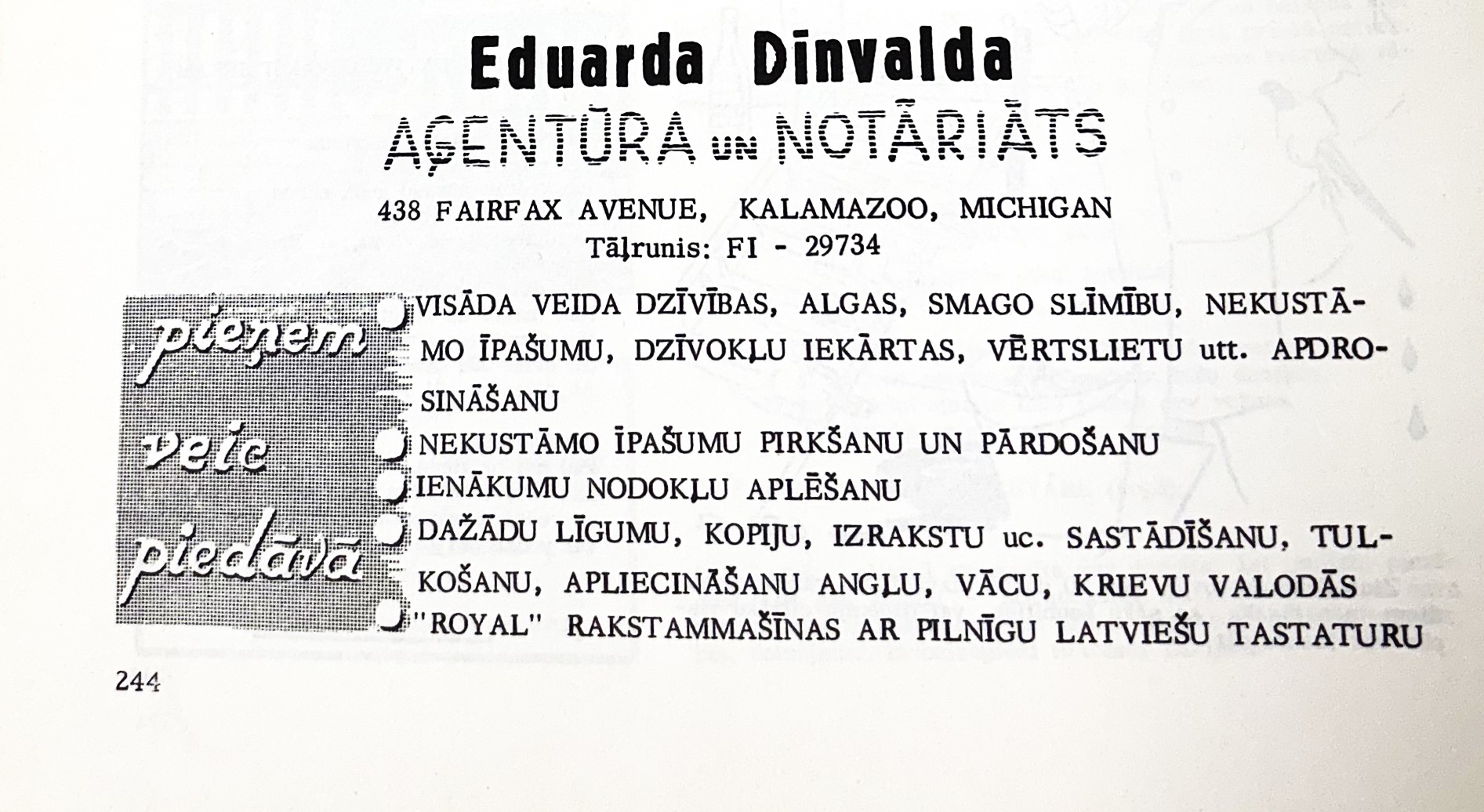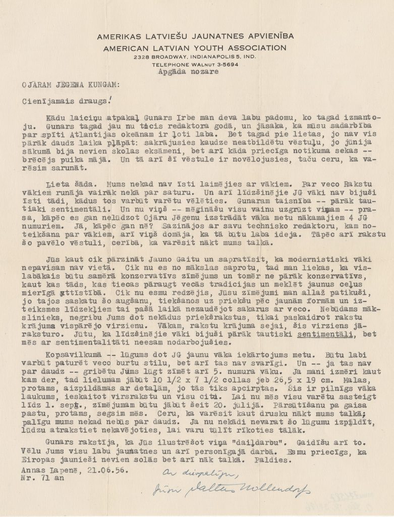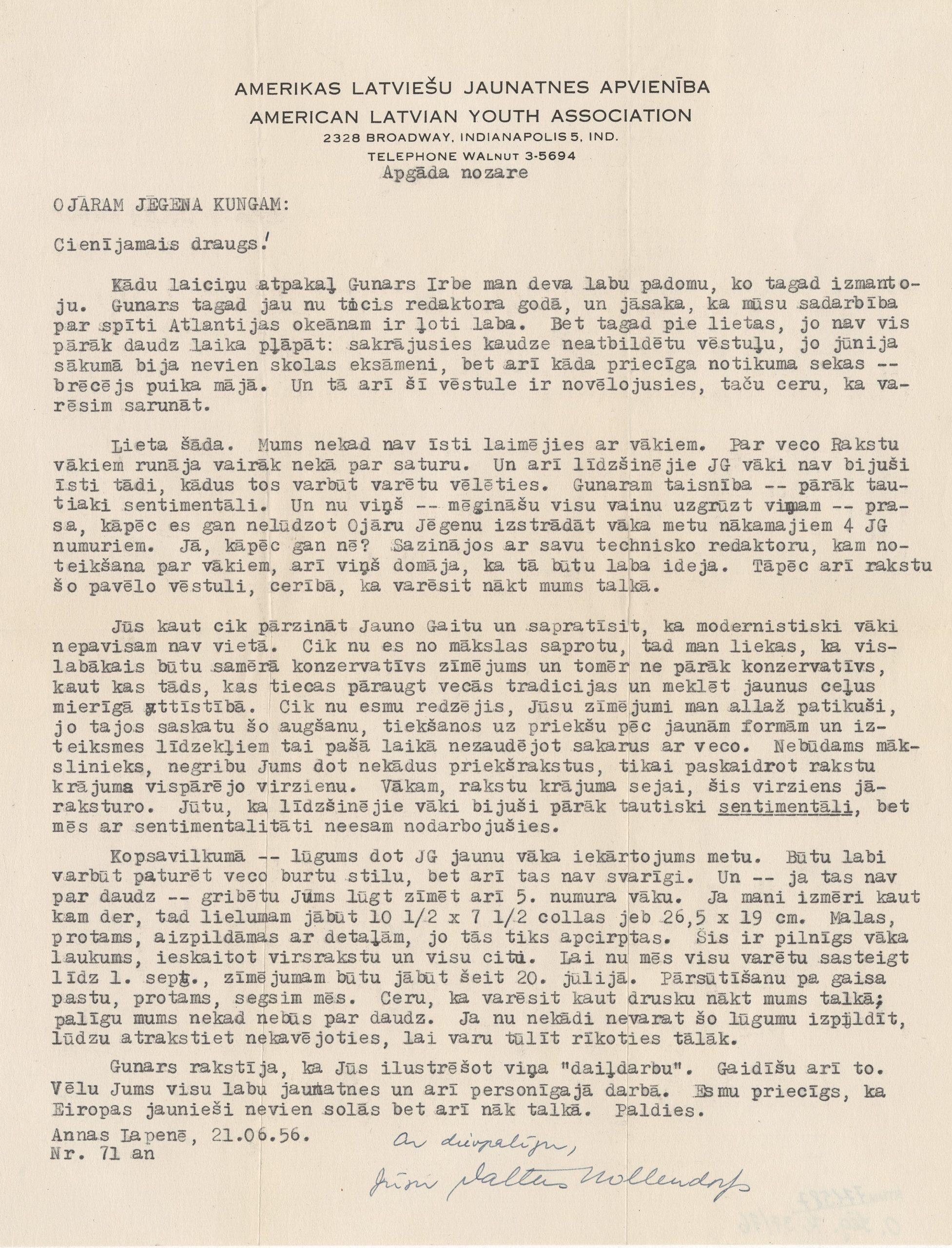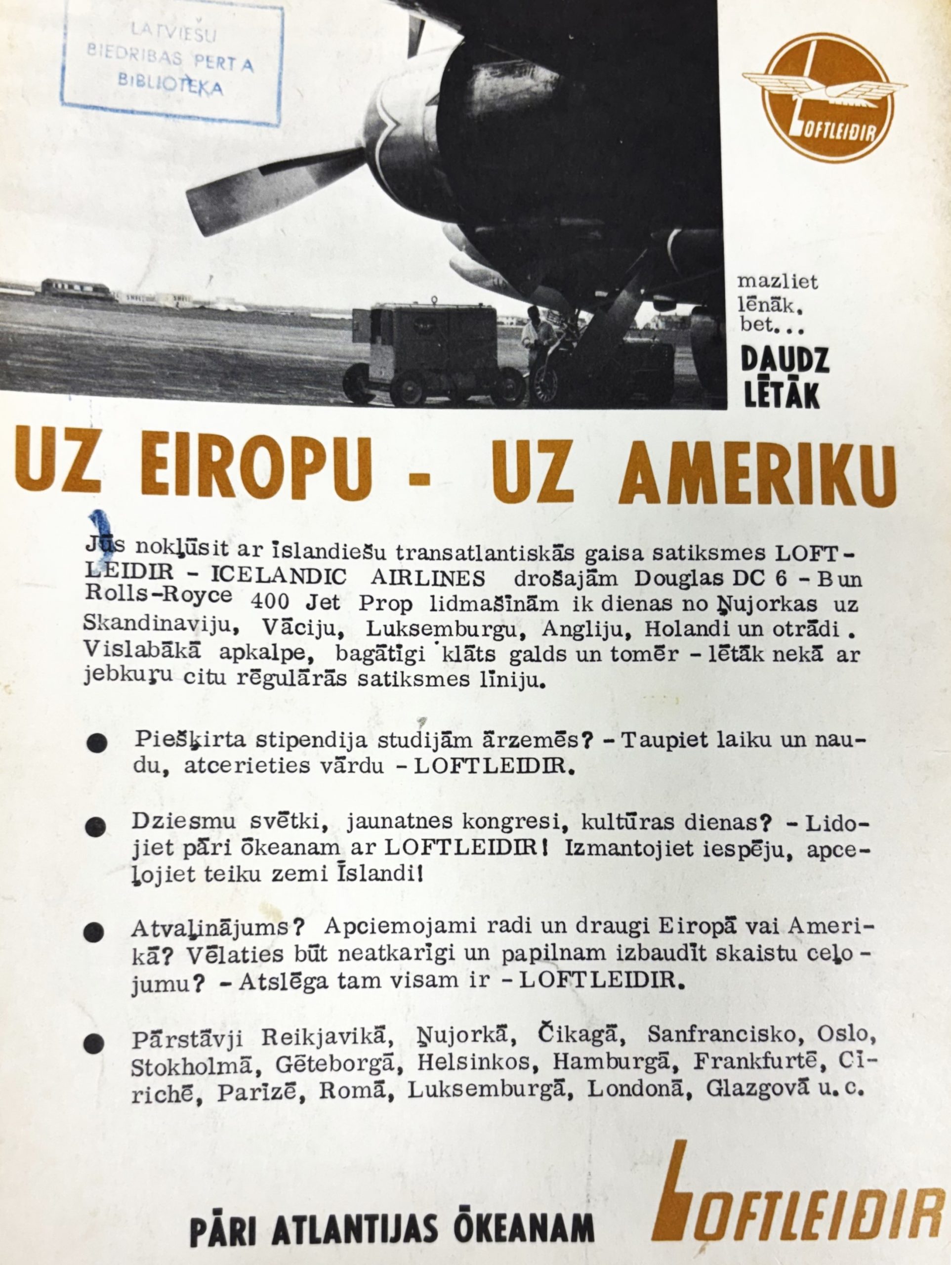 “JG 52. nr. esam ieguvuši islandiešu gaisa satiksmes sabiedrības Loftleidir sludinājumu. Mani inspirēja zināms “sentimentālisms” (esmu loftleidiram pateicīgs par divām iespējām nokļūt ASV un Kanādā – viņu lēto cenu dēļ) un arī ideja, ka ar šādu sludinājumu JG iegūtu īpašu prestiža grādu. Pēc šī sludinājuma varbūt “atvērsies acis” arī citām firmām.”