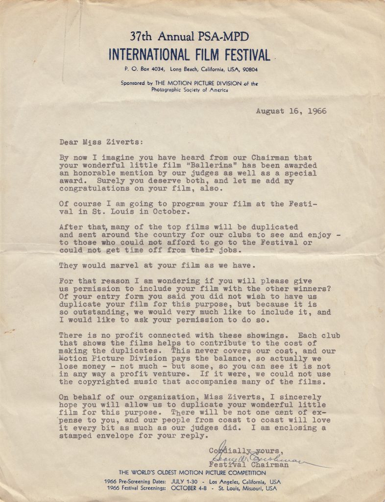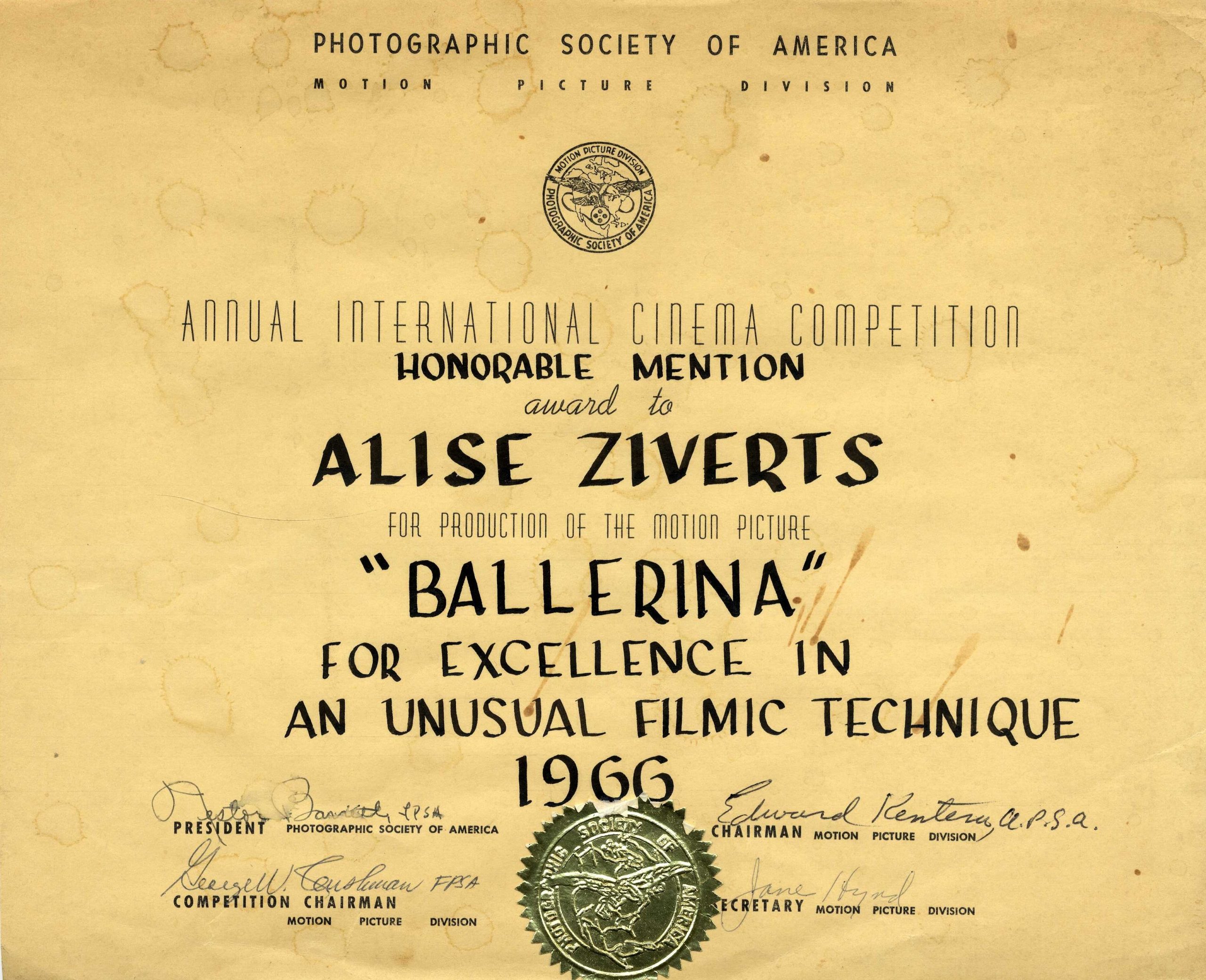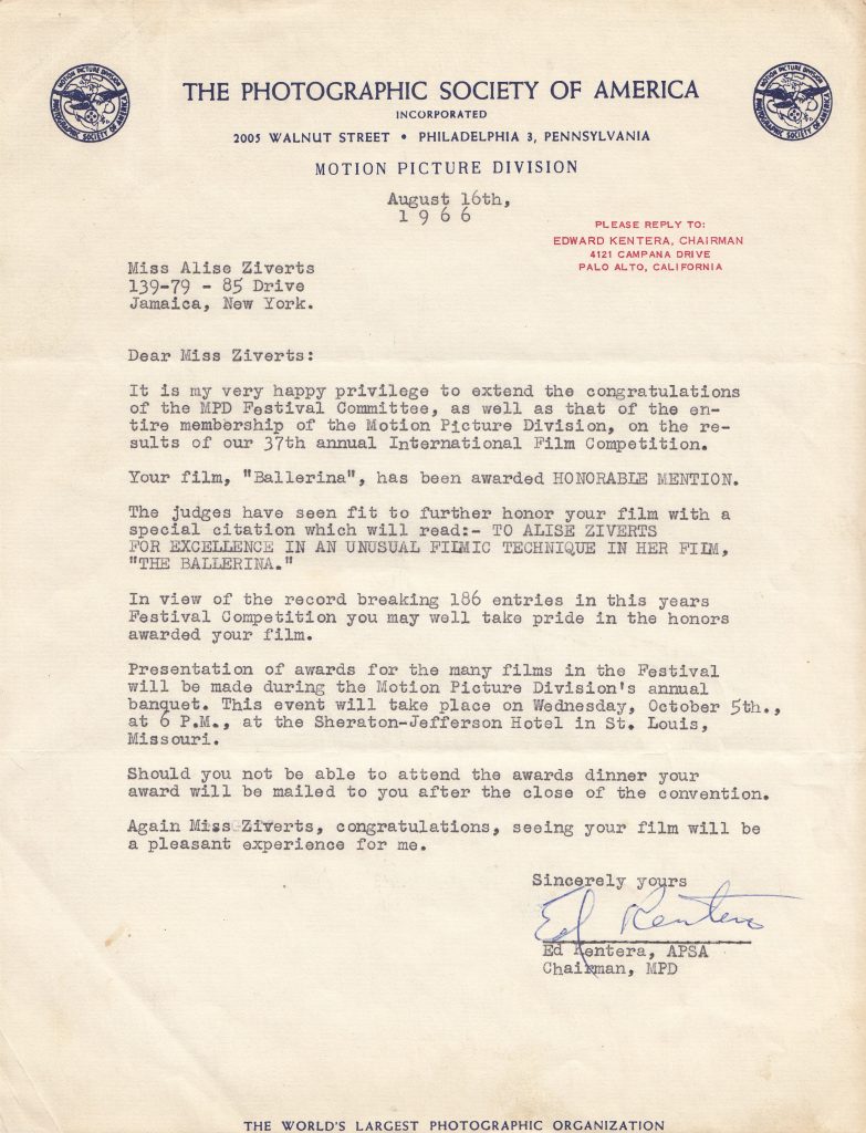 Your film “Ballerina” has now been awarded HONORABLE MENTION. The judges have seen fit to further honor your film with a special citation which will read: – to Alise Ziverts for excellence in an unusual filmic technique in her film “the Ballerina”. Tādu uzslavu saņēmu par savu filmu. Kas to būtu domājis, ka pirmo uzslavu saņemšu par zīmētu filmu, nevis par fotografētu! Un kad Kolumbijas Universitātē rādīju savu ballerinu, nesaņēmu nekādu uzmundrinājumu, ka tāda filma varētu gūt panākumus. Bija jāpaiet 3 gadiem – un Kalifornijā saņēmu uzslavu! Vismaz tagad man ir iemesls atkal kaut ko darīt.