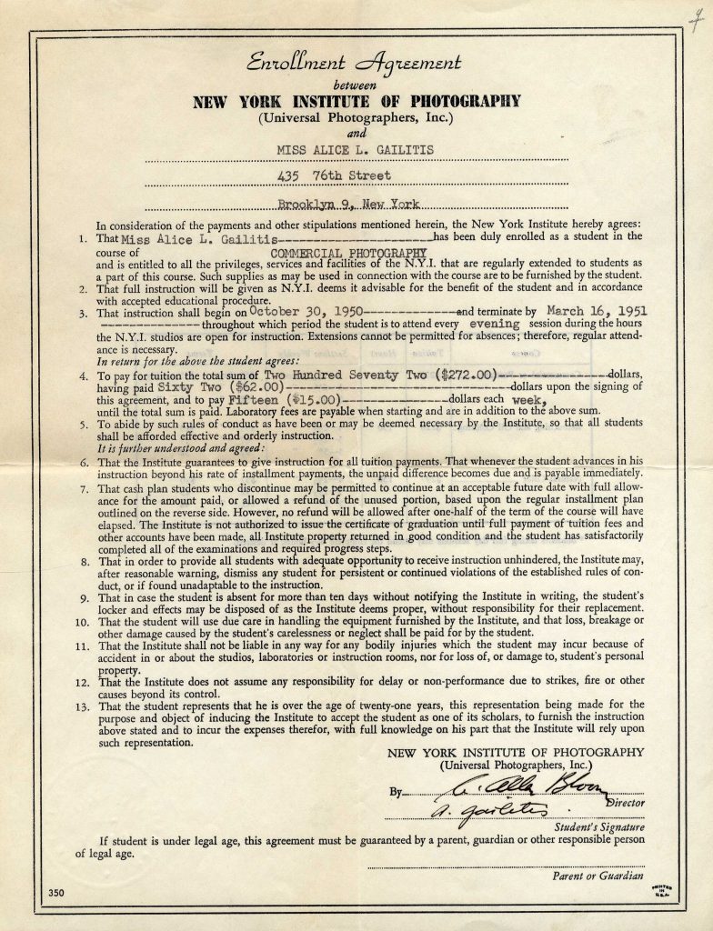 Alise strādāja kādā amerikāņu reklāmas aģentūrā. Kad apnika, aizgāja uz Ņujorkas pilsētas bibliotēku. Nopirka fotoaparātu „Leica” un ar to fotografēja visu mūžu. Abi ar Manfredu nekad nevarēja nosēdēt dīkā. Visu nopelnīto naudu brīvajā laikā pēc darba izdeva, apmeklējot dažādas fotogrāfijas skolas un kursus.