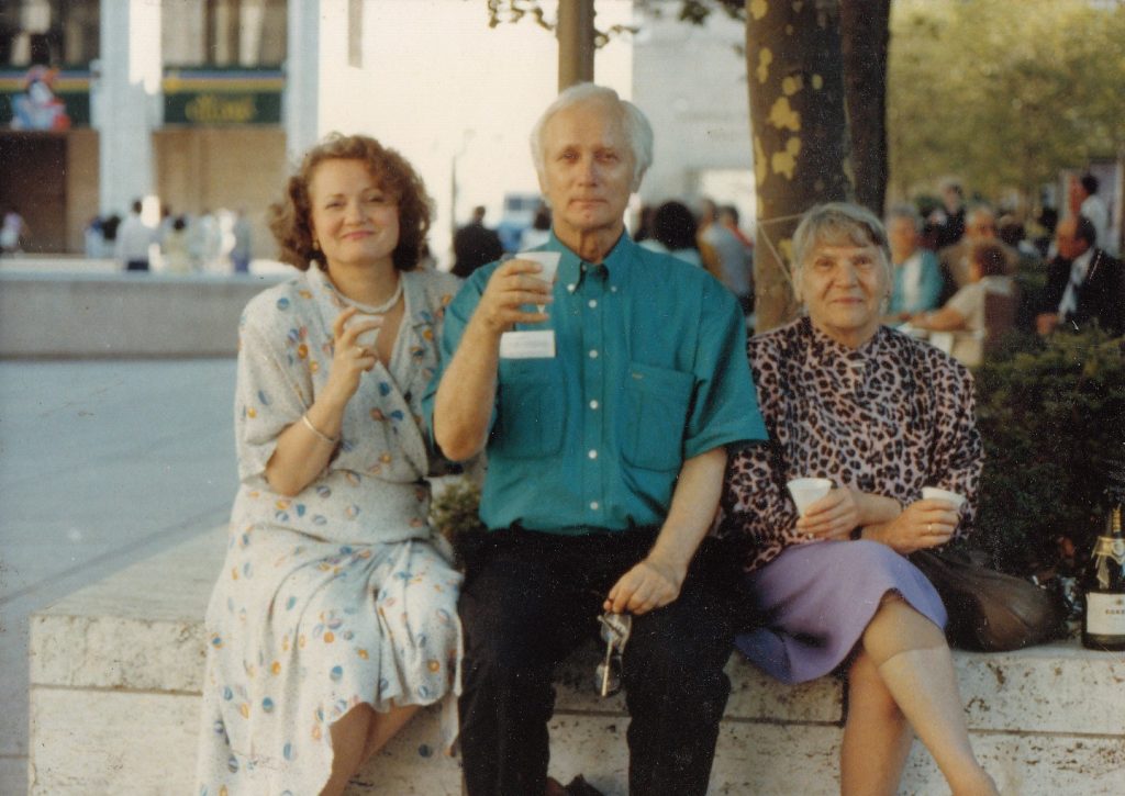 Sešpadsmitajā jūlijā es jums rakstīju par manas laulenes dzimšanas dienas svinēšanu operas apstādījumos. Bildīte no tā gadījuma. Alisei rokās divas papīra konveidīgas glāzītes. Nē, viņa nav liela “iemetēja”. Viņa pēc būtības ir pretalkoholiķe! Tā otrā glāzīte ir Kemplela, kuram bija kāre knipsēt. Bildē ukrainiete Lidija, Alises draudzene. Viņas abas strādāja vienā darba vietā (pilsētas bibliotēkā). Alise pensionējās, kad Boļšoi Ņujorkā bija beidzamo reizi – tas laikam pirms 7 gadiem. Bildē aiz muguras Pilsētas operas nams.