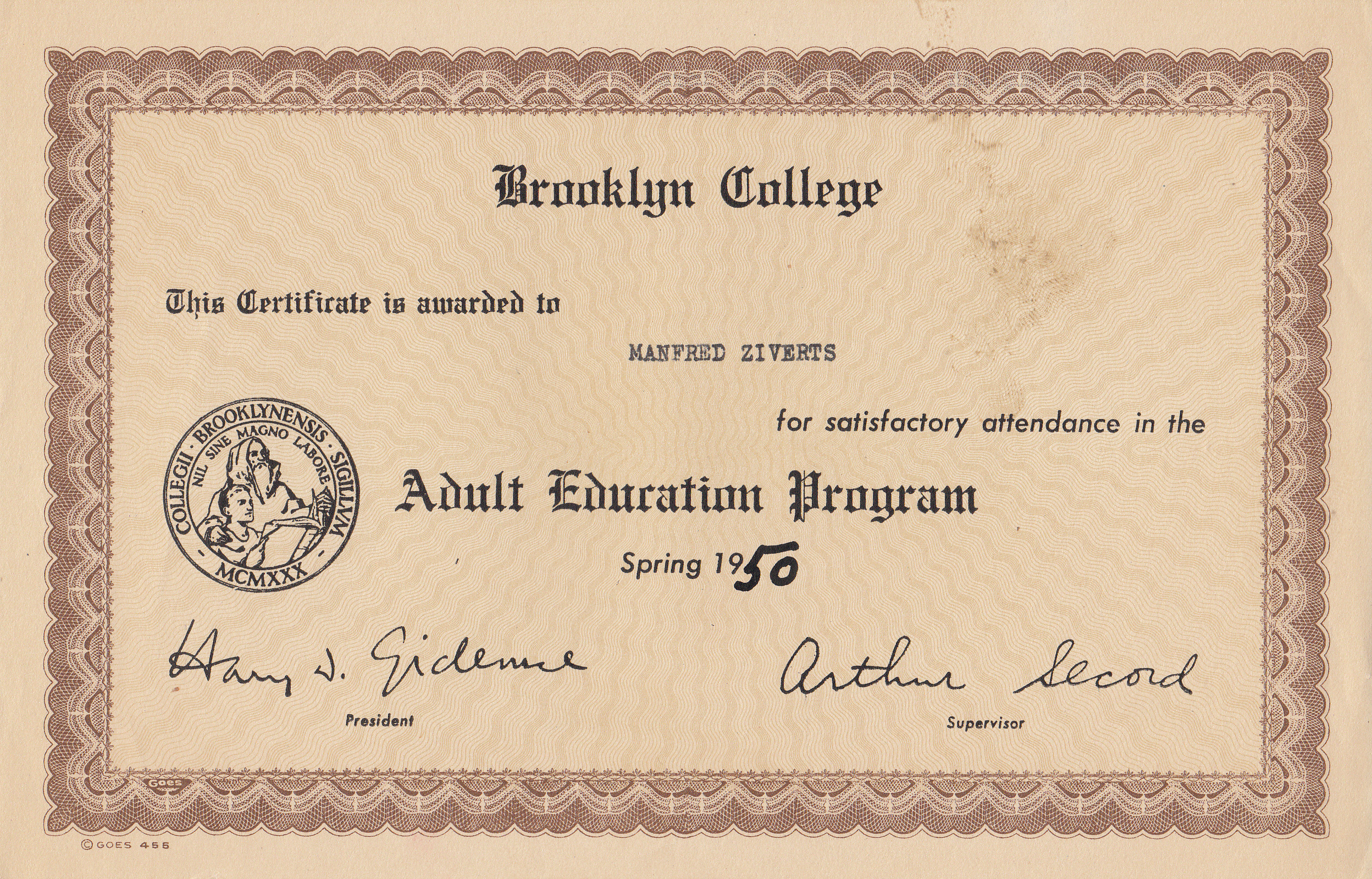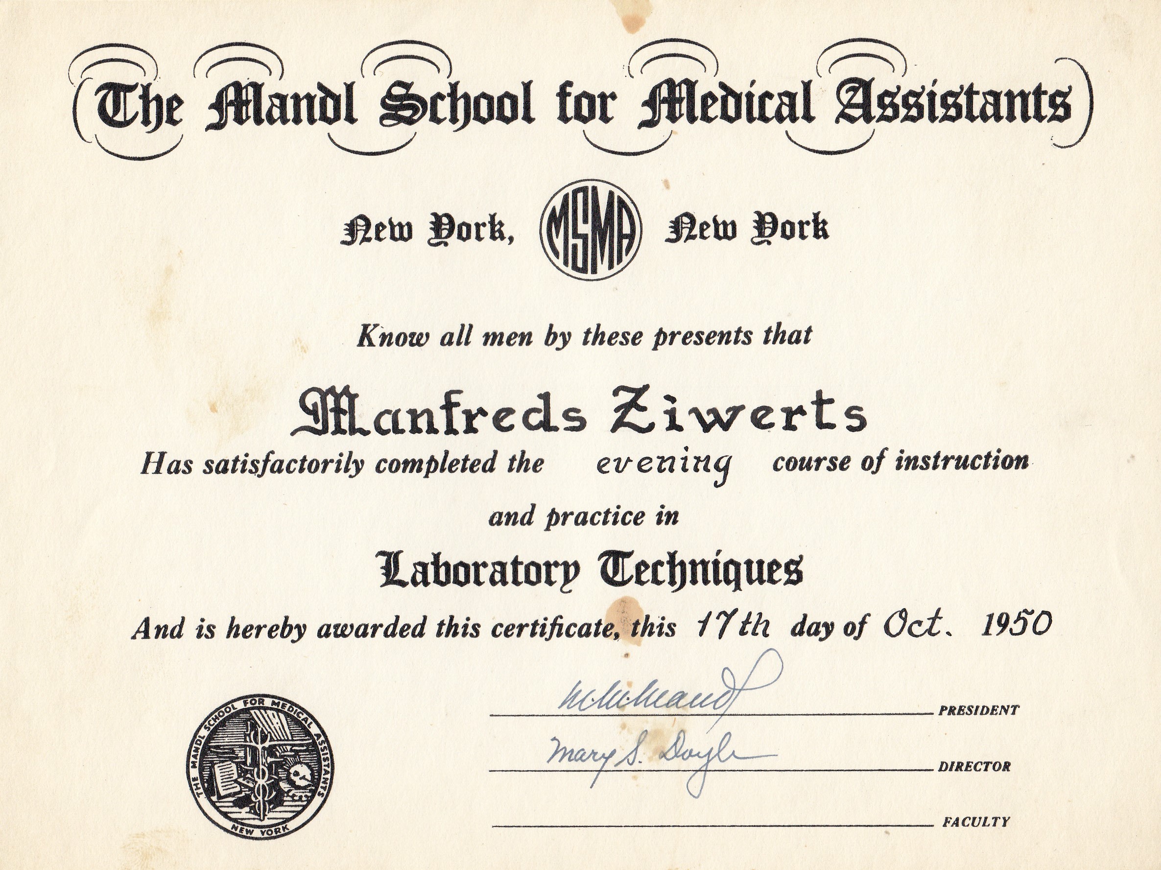 Nodoms netika realizēts, taču 1950.gada februārī Manfreds aizgāja no darba Grīnvičas hospitālī un bez studiju maksas iestājās Bruklinas koledžas Medicīnas asistentu skolā.