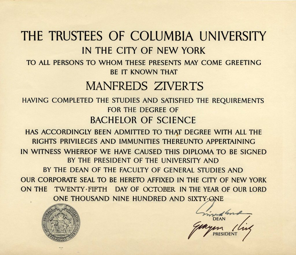 Manfreds 50.gadu sākumā sāka strādāt Jāņa Rīsberga celtniecības uzņēmumā Longailendā, taču vēlāk iekārtojās darbā Kolumbijas Universitātes bibliotēkā, kur nostrādāja 29 gadus un izpaudās arī fotografēšanā: “Tā jau nav, ka darbā es tikai fotografēju meitenes. Fotografēju arī zēnus un vīriešus. Fotografēju visus – kuri atļauj man to darīt.” Darbs universitātē sniedzis arī iespēju paralēli turpināt izglītoties dažādos kursos: “Jaunības grēki jāizpērk vecumā, un tāpēc es vēl studēju. Studēšana nav ar pilnu tvaiku, jo pa dienu tomēr jāstrādā 7 stundas.”