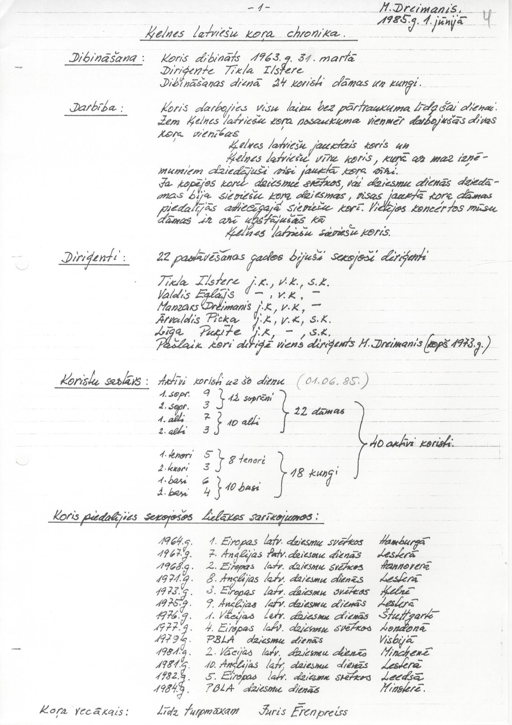 Pēc bēgļu nometņu Vācijā likvidācijas Vesthovenā pie Ķelnes apmetās ap 150 latviešu. Izjūtot kultūras un sabiedriskās dzīves trūkumu, Vesthovenas latviešu vidū bija dzīva ideja par kora dibināšanu. Kā radošs impulss idejas realizēšanai bija plānotie I Eiropas latviešu Dziesmu svētki Hamburgā 1964. gadā. Koris dibināts 1963. gada 31. martā.
