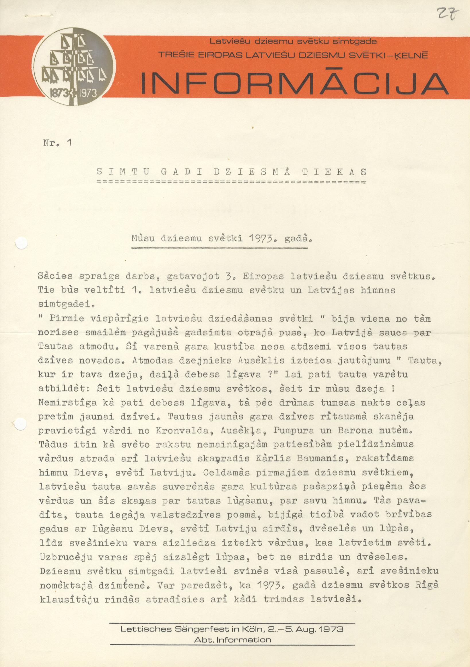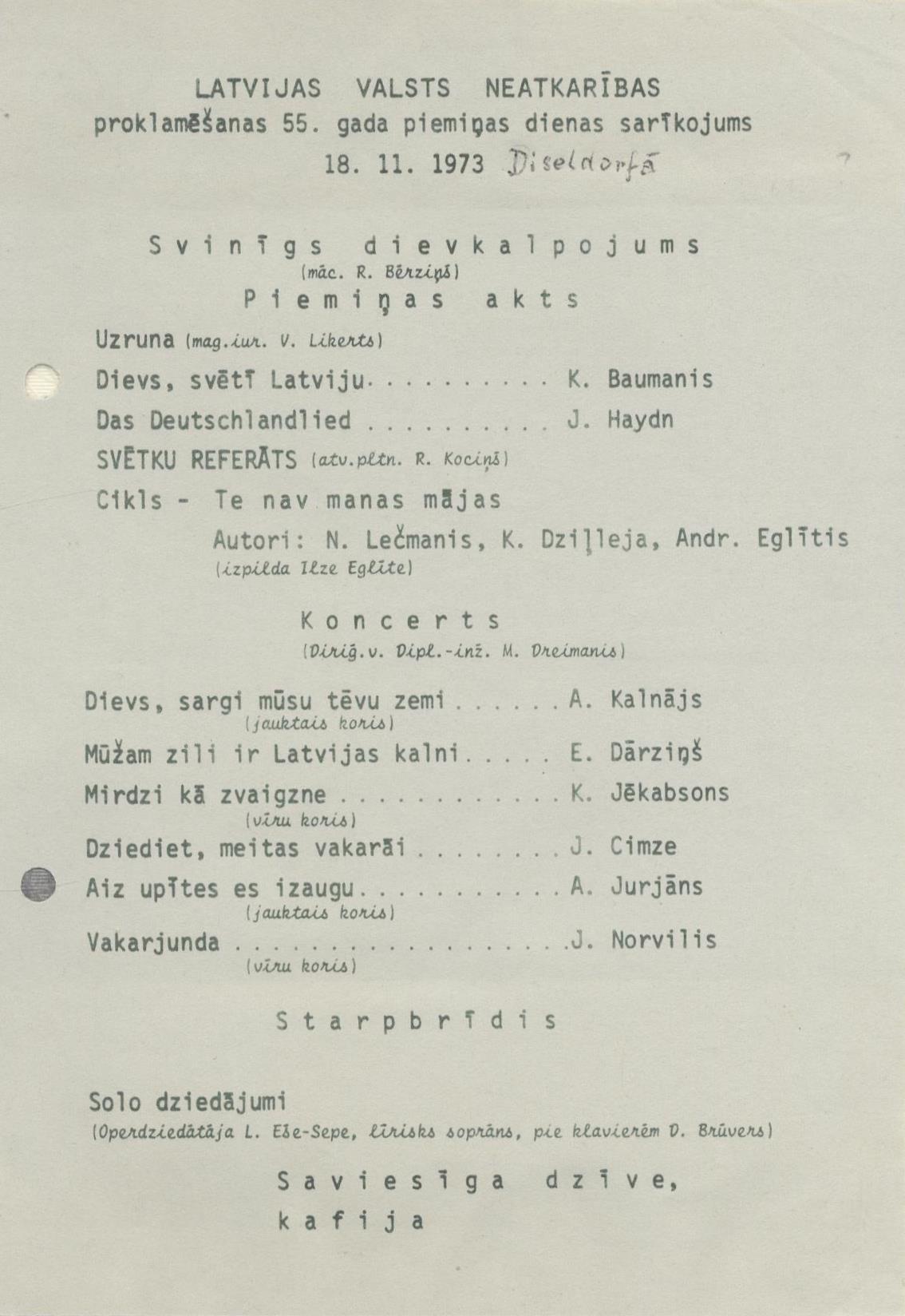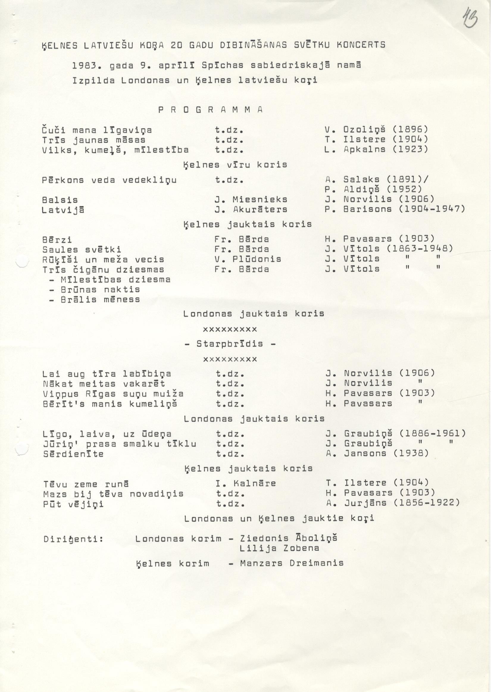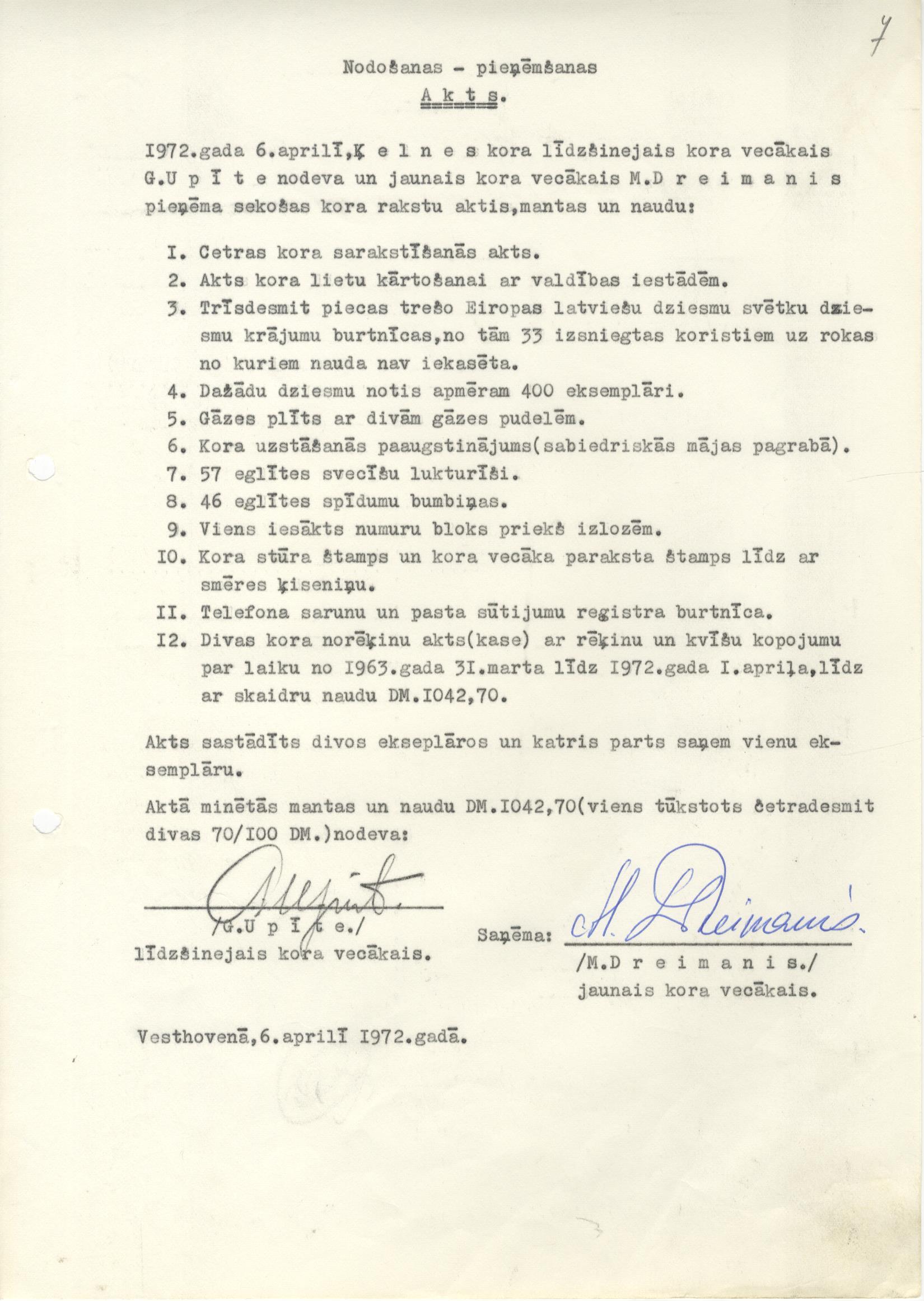 Fonda saturu veido dokumenti par kora darbību – koncertu un Dziesmu svētku programmas, koristu saraksti, mēģinājumu plāni, sarakste par koncertdarbību, fotogrāfijas, kora darbības hronikas un albumi.