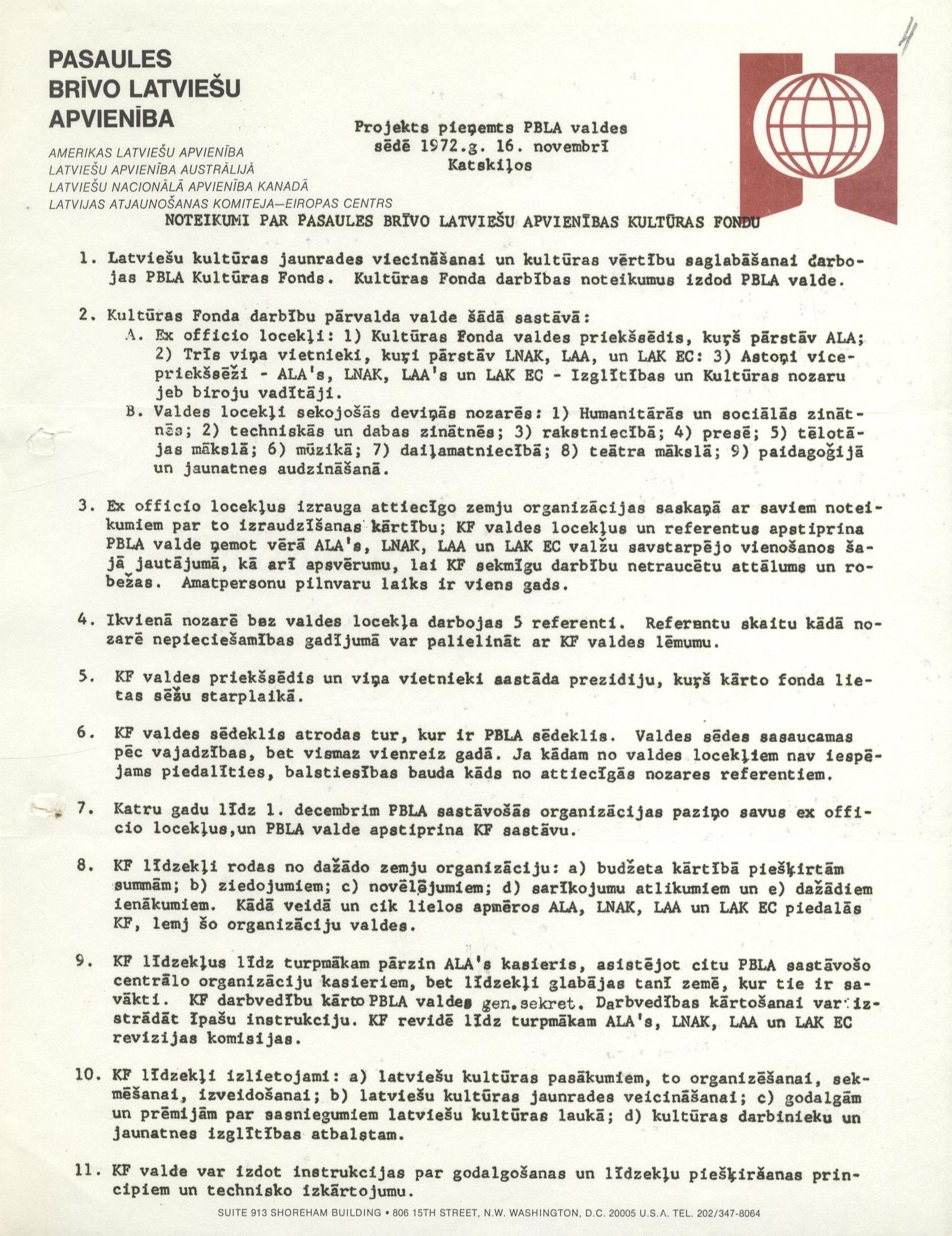 Visai trimdas latviešu sabiedrībai kopīga kultūras fonda ideja radās jau 20. gs. 50. gados, tomēr tās īstenošana aizkavējās. Tika izveidoti atsevišķi mītnes zemju un reģionālie kultūras fondi. 1972. gada 12. jūnijā Ziemeļamerikas latviešu kultūras fonda priekšsēdētājs Visvaldis Klīve atkārtoti aicināja izveidot globālu kultūras fondu. Lēmums par Pasaules brīvo latviešu apvienības Kultūras fonda dibināšanu tika pieņemts apvienības valdes sēdē 1972. gada 16. novembrī. Fonda valdes pirmā sēde notika 1973. gada 31. augustā Klīvlendā.