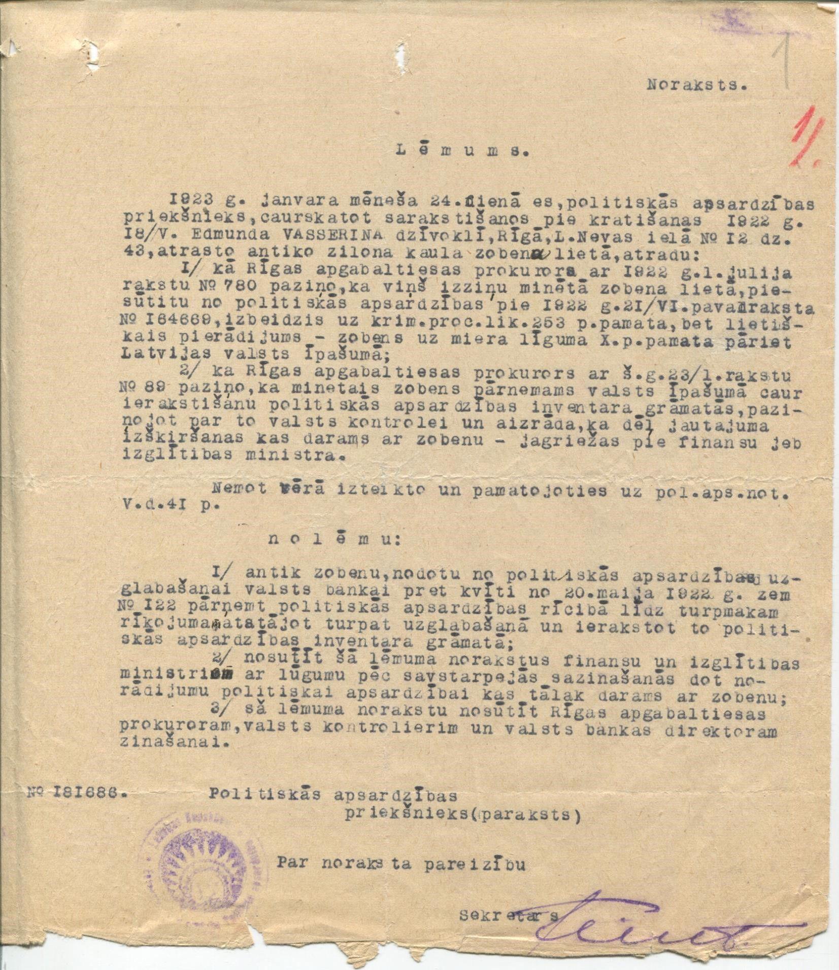 Viss sākās 1922. gada 18. maijā, kad kratīšanā Edmunda Vasseriņa (Vasariņa) dzīvoklī Rīgā Iekšlietu ministrijas Politiskās apsardzības nodaļas aģenti konfiscēja ziloņkaula zobenu, par kura īpašniekiem uzdevās Edmunds Vasariņš un Voldemārs Kalniņš. Abi skaidrojuši, ka zobenu ieguvuši no kāda Ludviga Vasariņa, kurš zobenu pircis Maskavā un ievedis Latvijā. 1923. gada 13. martā Iekšlietu Ministrijas Politiskās apsardzības nodaļa aizturēto zobenu nodeva Valsts mākslas muzejam.