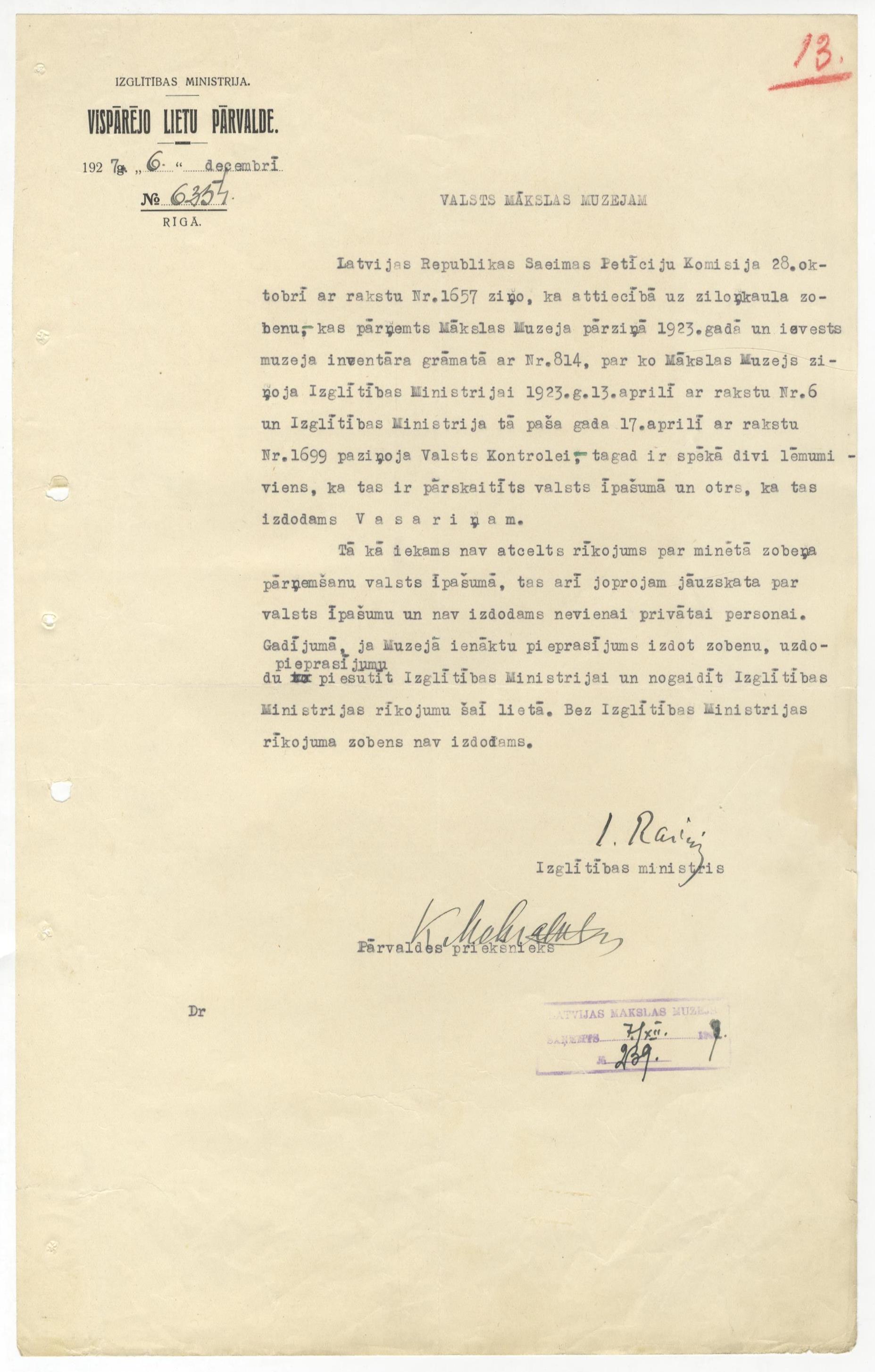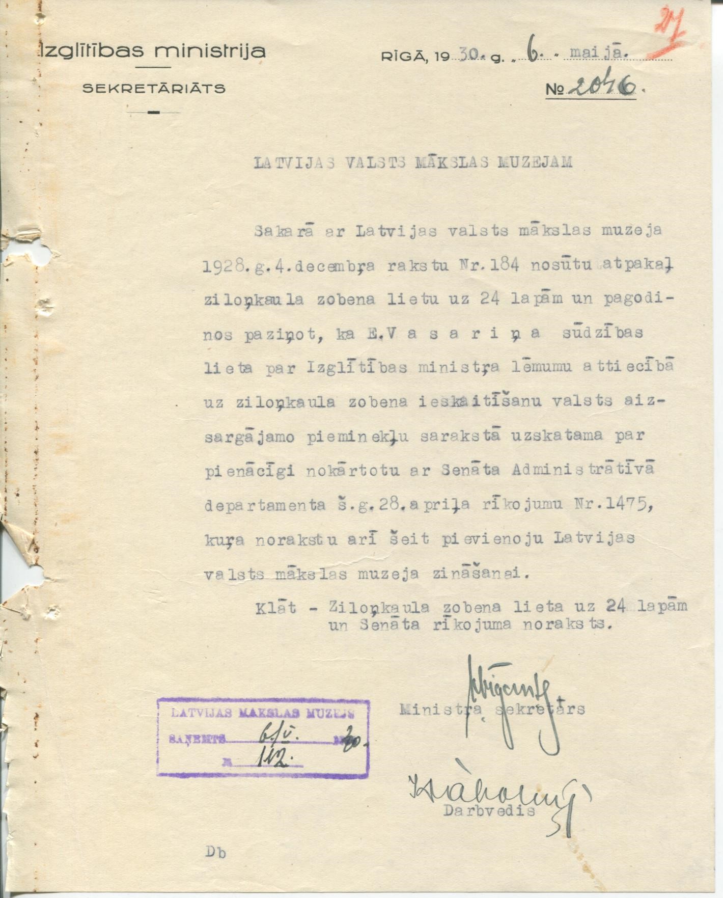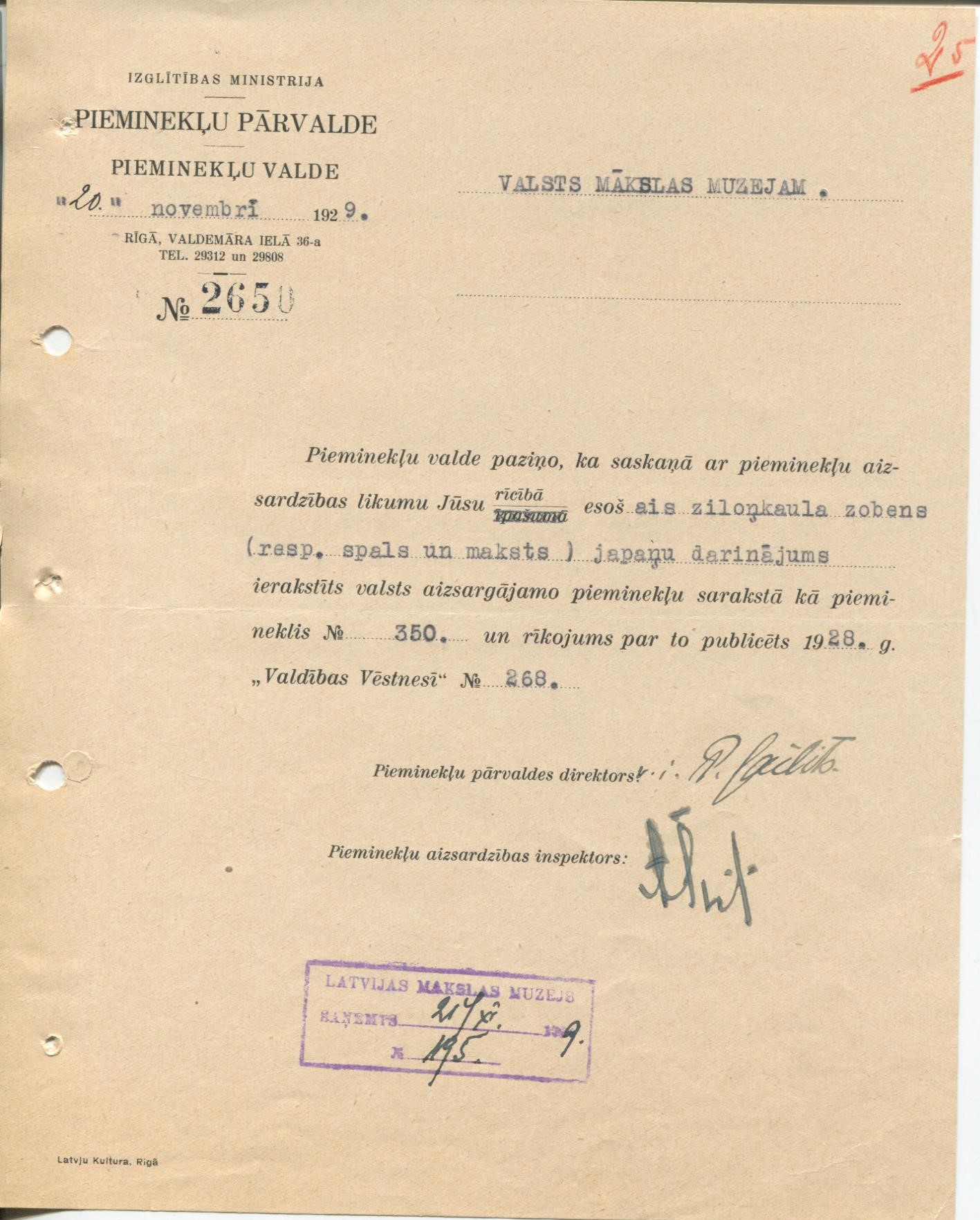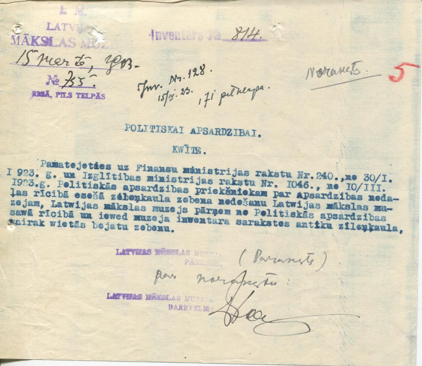Galvenais stāsta “varonis” – ziloņkaula zobens glabājas Latvijas Nacionālā mākslas muzeja krājumā, bet Latvijas Nacionālā arhīva Latvijas Valsts arhīvā šie interesantie dokumenti.