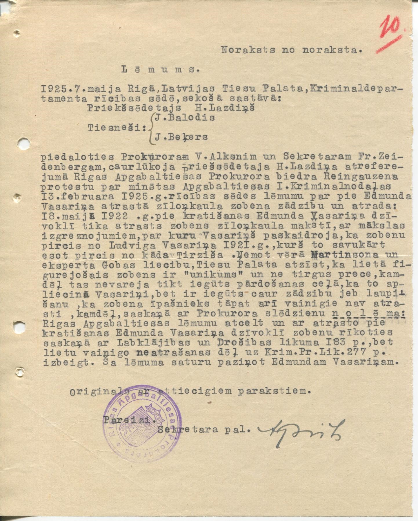 Bet tomēr tik skaisti viss nebija, un turpinājās tiesvedība Rīgas apgabaltiesā, kuras gaitā tika izskatīts jautājums par to, kas gan ir šis zobens, – ierocis vai mākslas darbs, kurš tad ir viņa patiesais īpašnieks, – valsts vai Vasariņš... Atklājās jaunas nianses par to, kā Vasariņš pie zobena ticis. Izskanēja versija bez apstiprinājuma, ka zobens pirms 1917. gada revolūcijas Krievijā piederējis Romanovu dinastijai, saņemts kā dāvana no Japānas imperatora un revolūcijas laikā ticis nolaupīts.