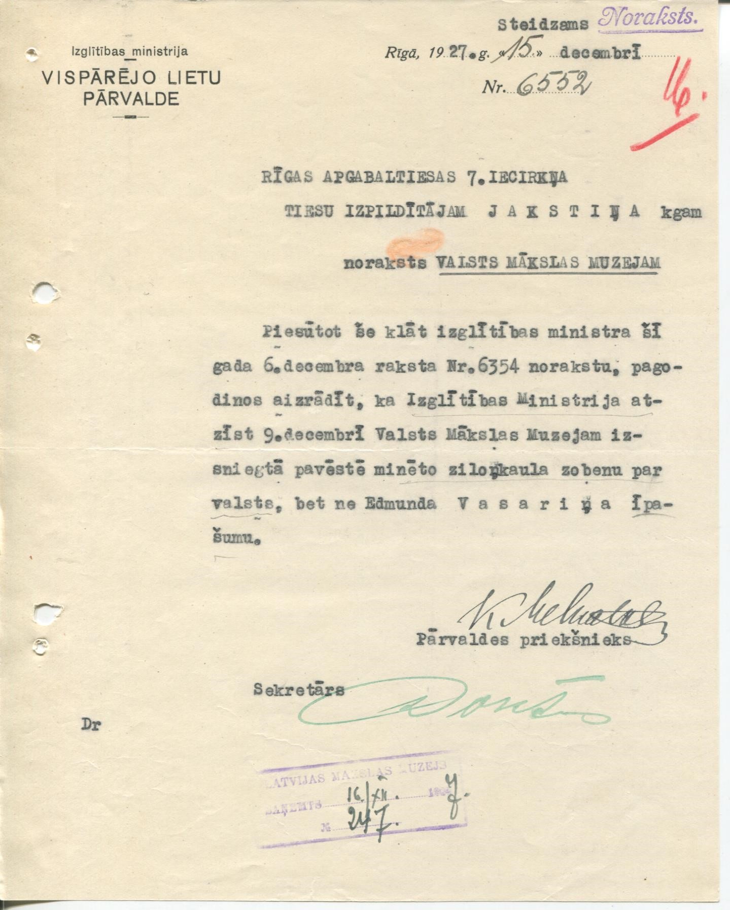1924. gada 7. maijā Rīgas muitas valdē zobenam veica ekspertīzi, klātesot māksliniekam Gustavam Šķilteram, un zobenu notaksēja ar vērtību 60 000 (sešdesmit tūkstoši) latu. Ja E.Vasariņš samaksā naudas sodu – 5 procentus no 60 000 latiem, tad viņam ir pilnas tiesības saņemt zobenu atpakaļ.