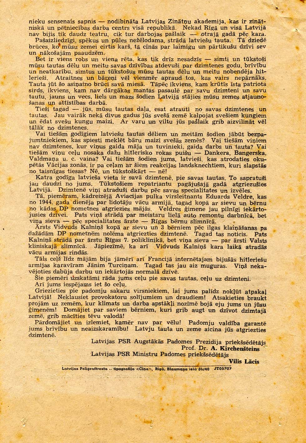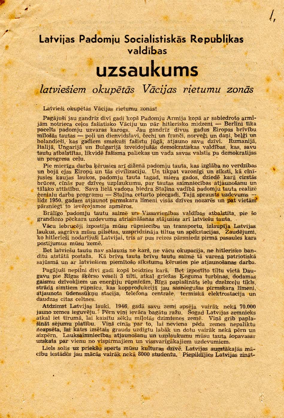 | Latvijas PSR valdības uzsaukums latviešiem. LVA, 1971. f., 1. apr., 54. l., 1. lp., 1. o.p. lp. |