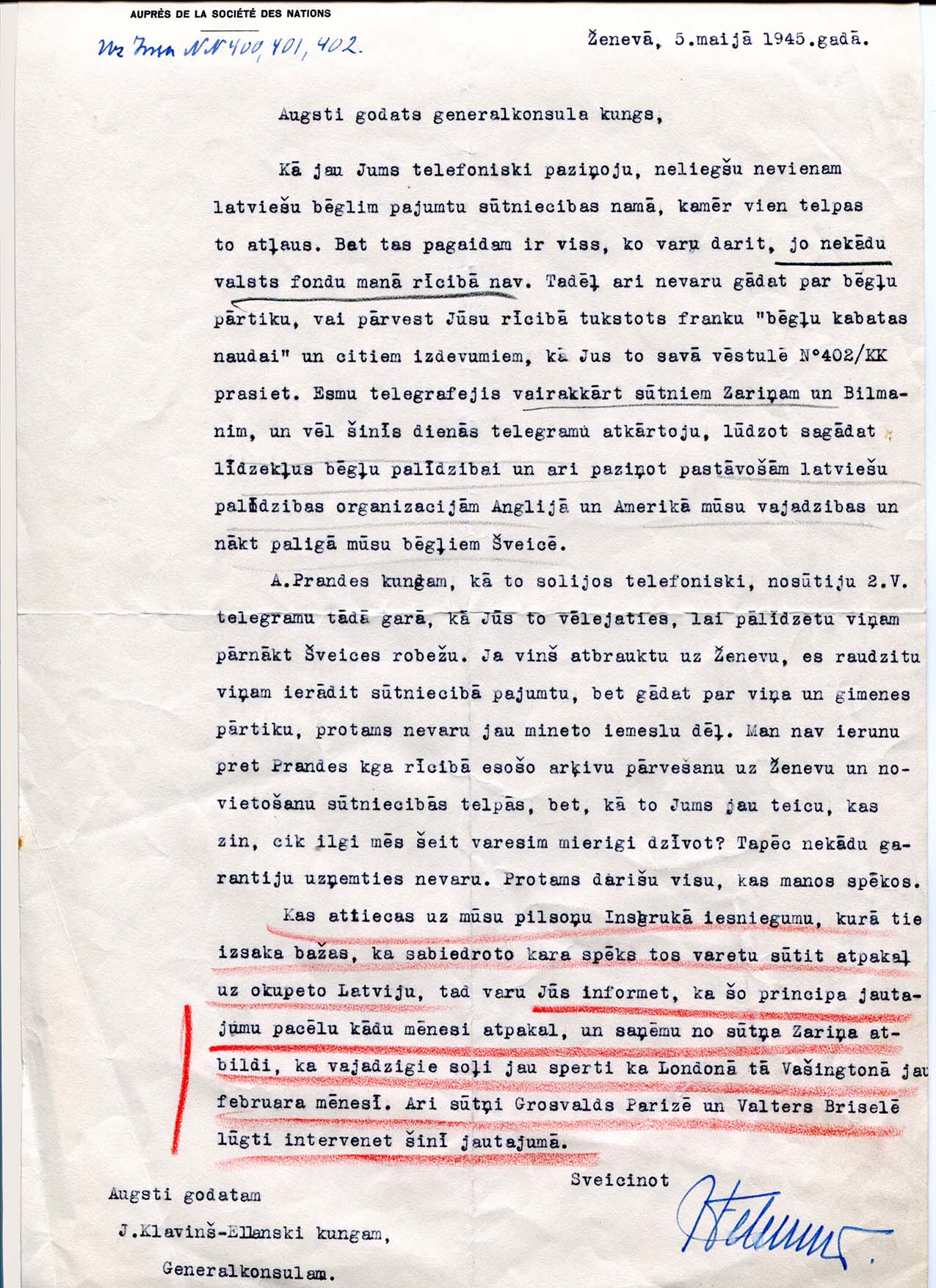 | J. Feldmaņa sūtņa Ženēvā vēstule ģenerālkonsulam J. Kļaviņam-Ellanskim. 1945. gada 5. maijs. LVA, 2176. f., 2v. apr., 270. l., 2. lp. |