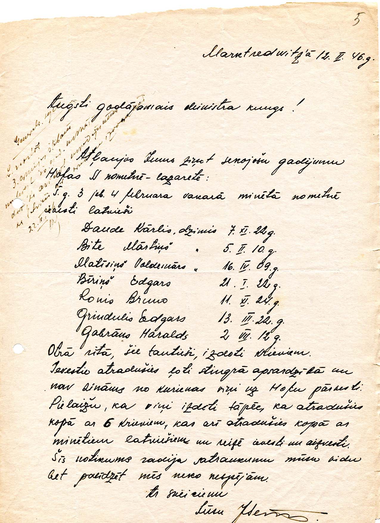 | Vēstule par Hofas nometnē-lazaretē ievesto latviešu izdošanu PSRS. 1946. gada 12. februāris. LVA, 2176. f., 2v. apr., 121. l., 5. lp. |