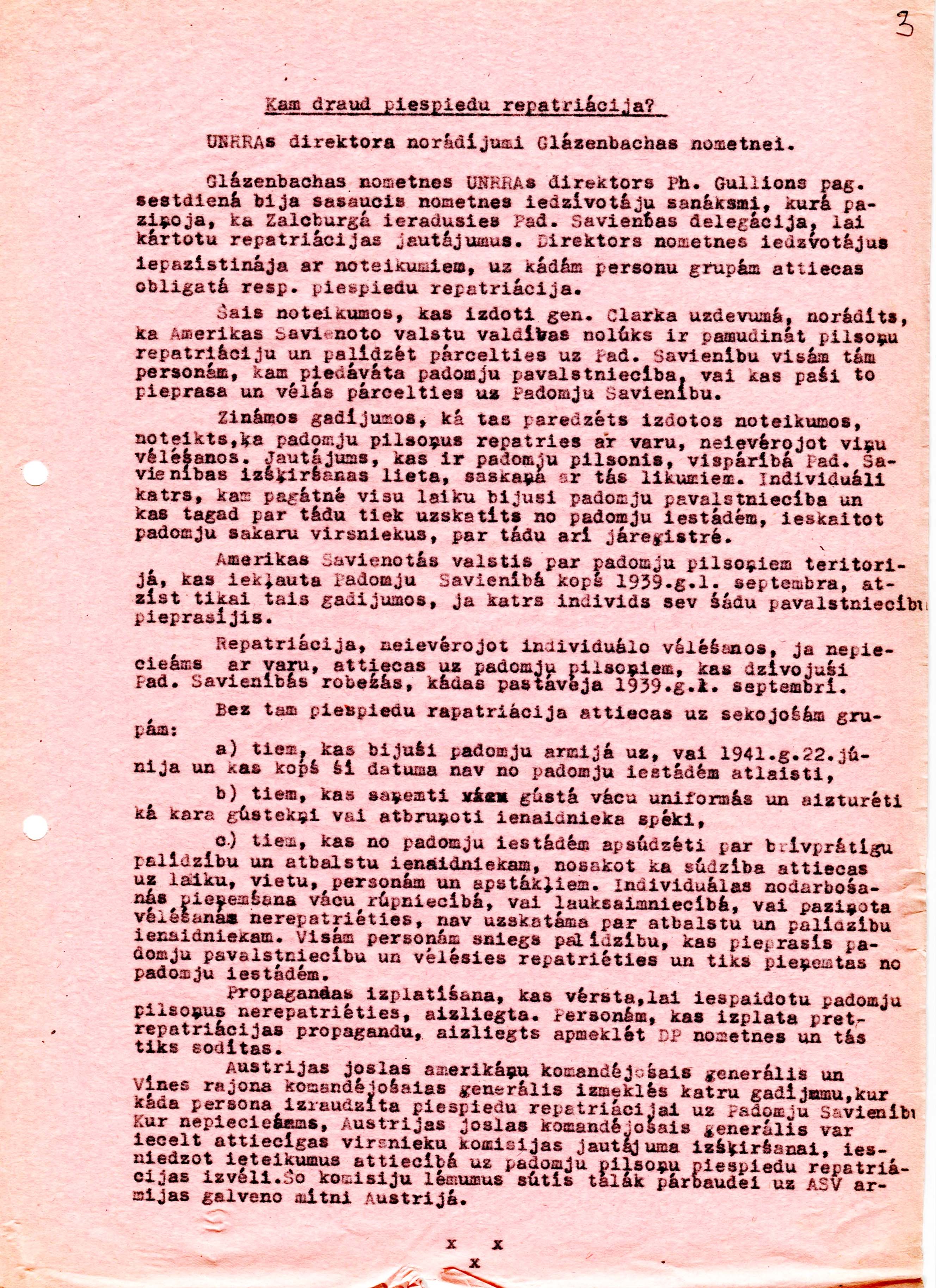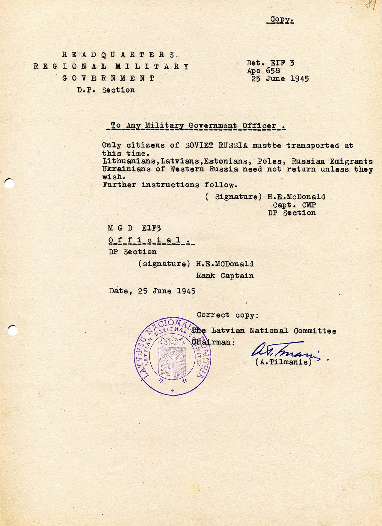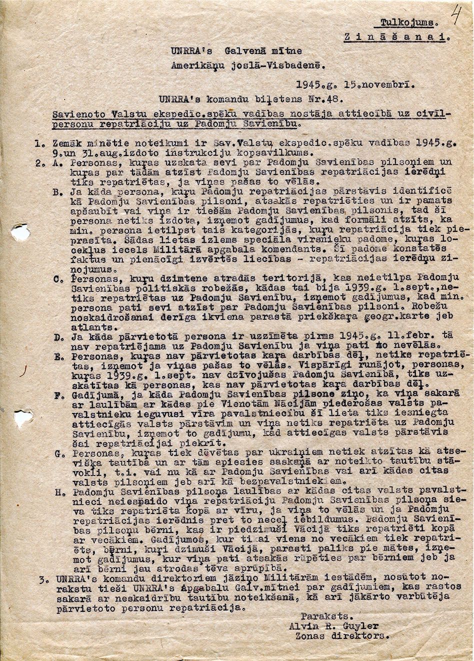 | Amerikas Savienoto Valstu ekspedīcijas spēku vadības nostāja attiecībā pret repatriāciju uz Padomju Savienību. Tulkojuma noraksts. 1945. gada 15. novembris. LVA, 2335. f., 1. apr., 281 l., 4. lp. |