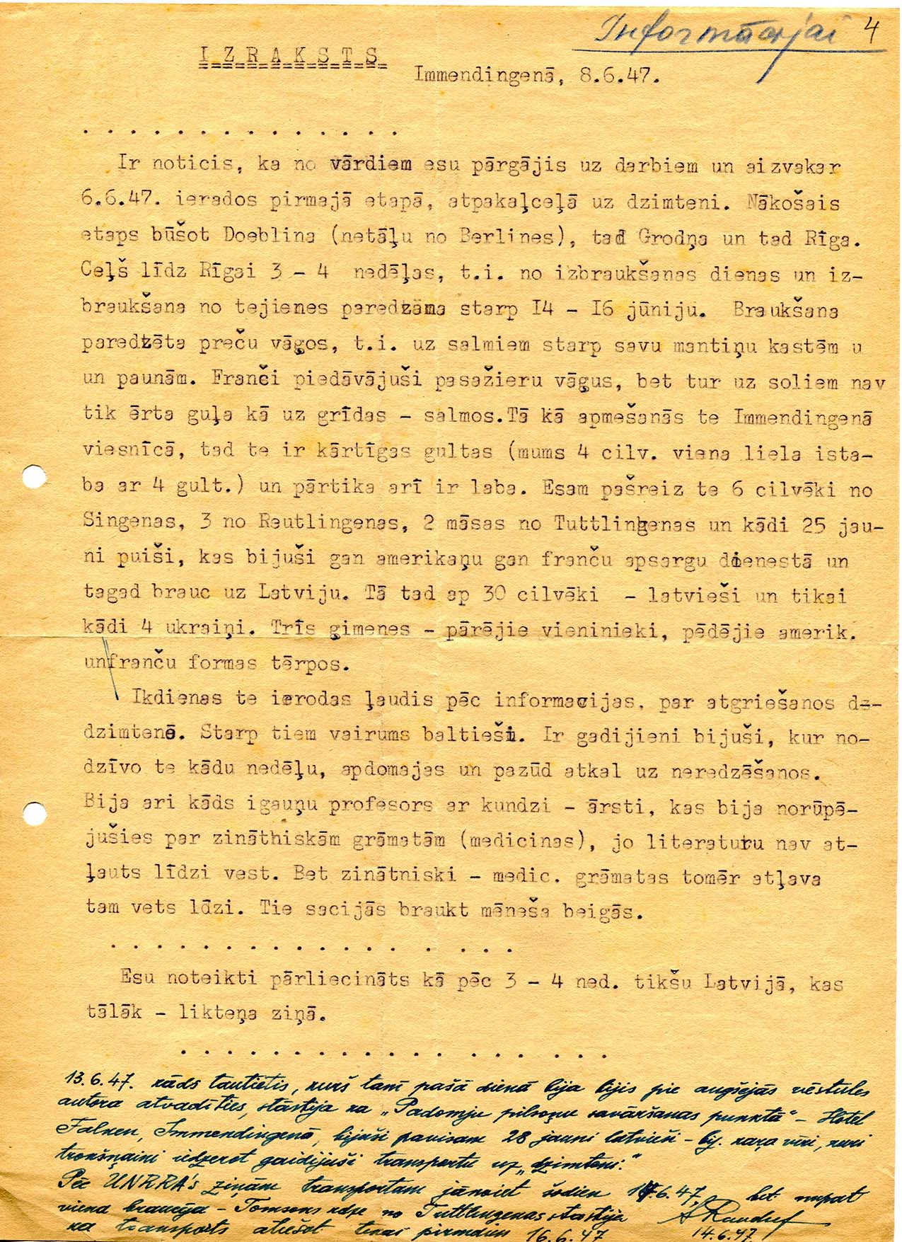 | Informācija par atgriešanos Latvijā. 1947. gada jūnijs. LVA, 2176. f., 2v. apr., 172. l., 4. lp. |
