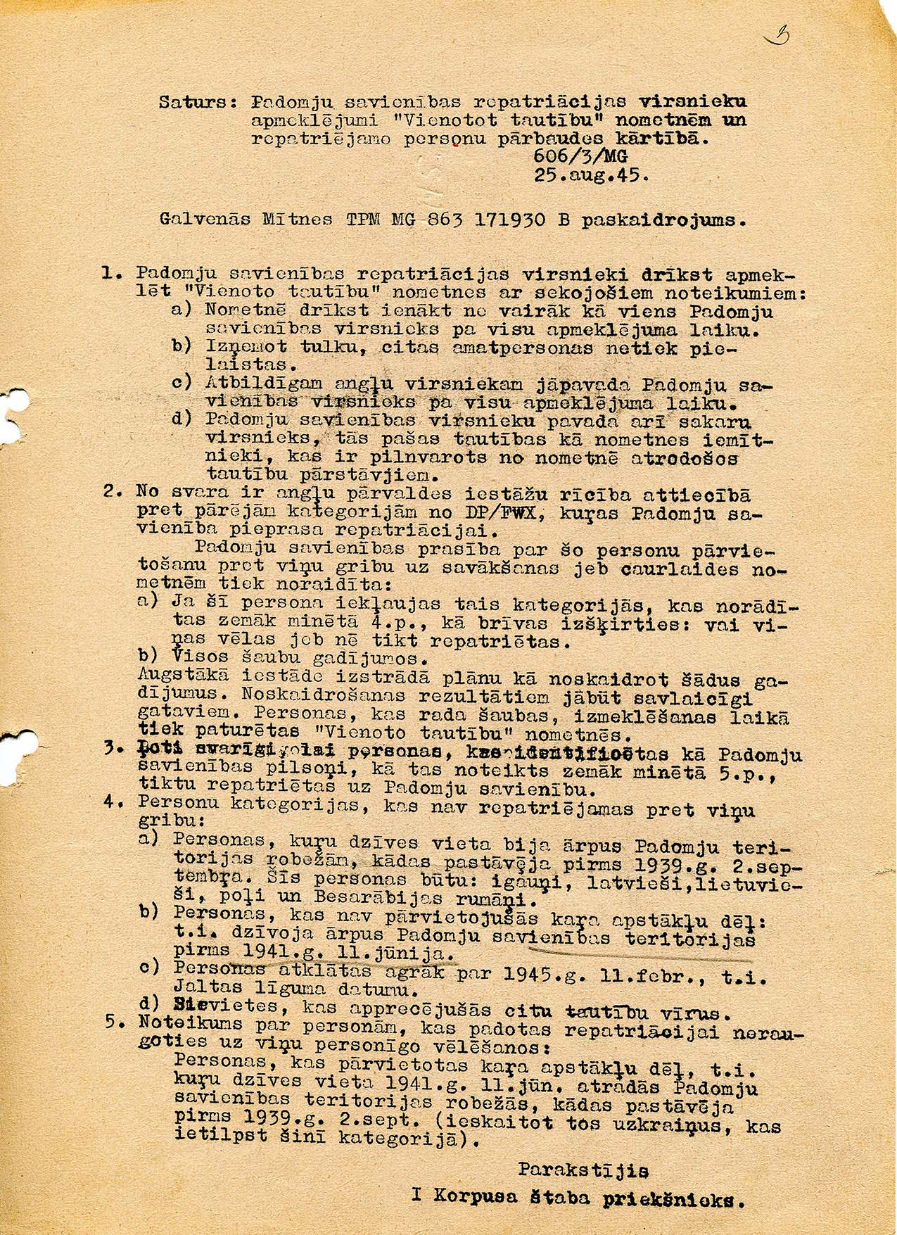 | Paskaidrojums par repatriējamo personu pārbaudes kārtību. 1945. gada 25. augusts. LVA, 2176. f., 2v. apr., 8. l., 3. lp. |