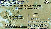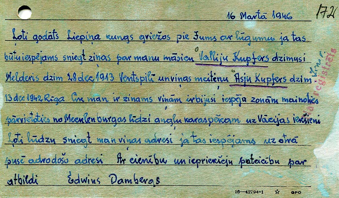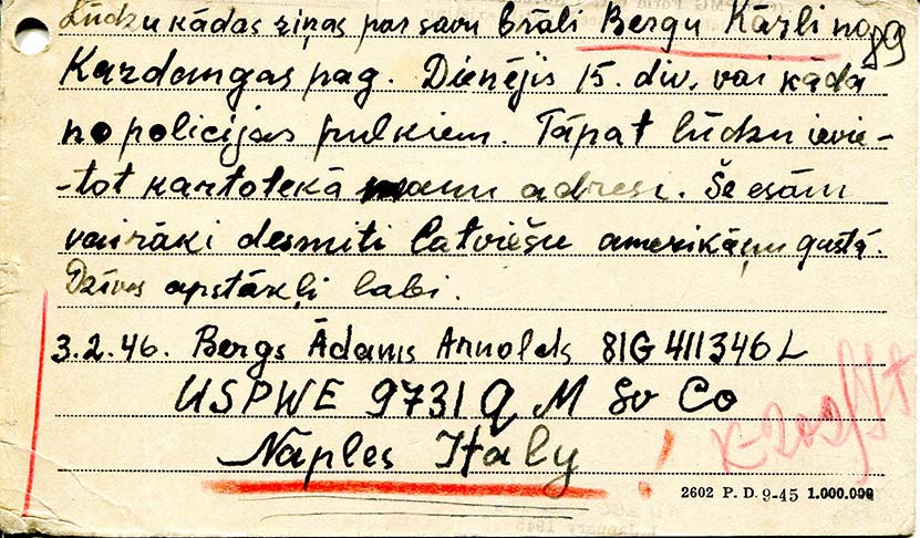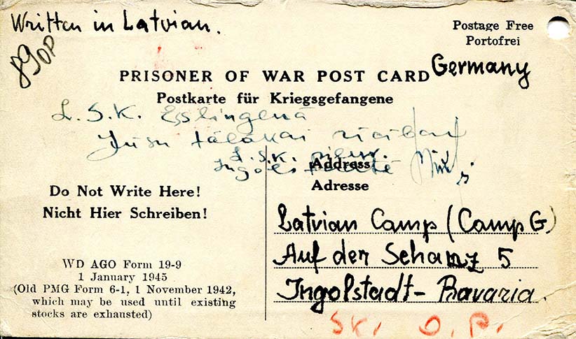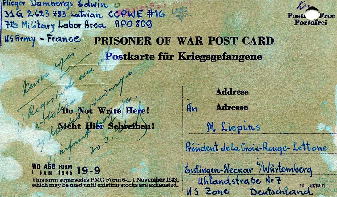 Latviešu karagūstekņa Francijā Latvijas Sarkanajam krustam sūtītā pastkarte. 1946. gada 16. marts.