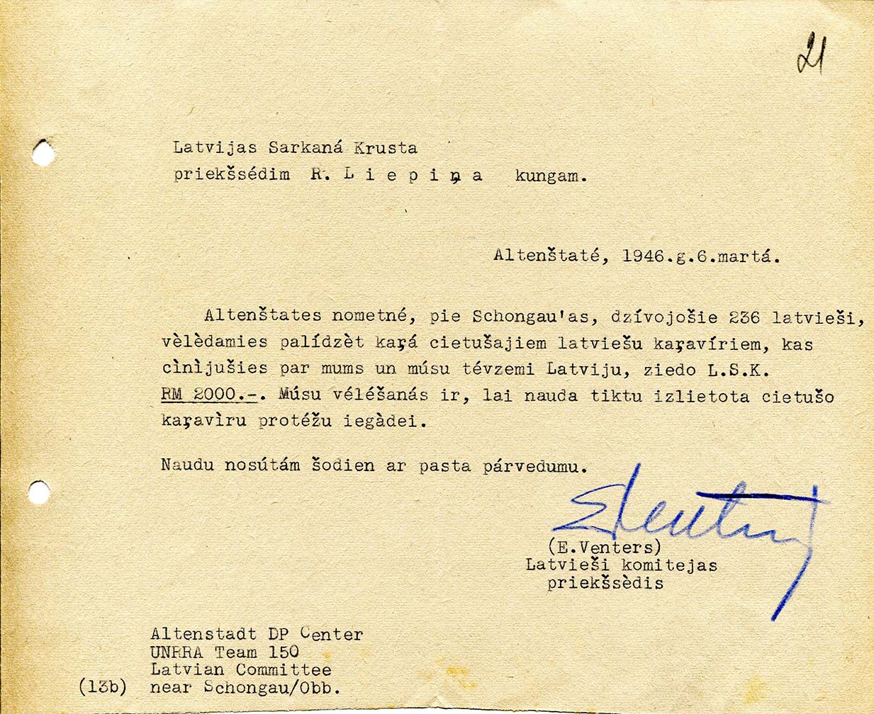 UNRRAs Latviešu komitejas vēstule Latvijas Sarkanajam krustam par Altenštates nometnes latviešu ziedojumiem latviešu karavīriem. 1946. gada 6. marts.