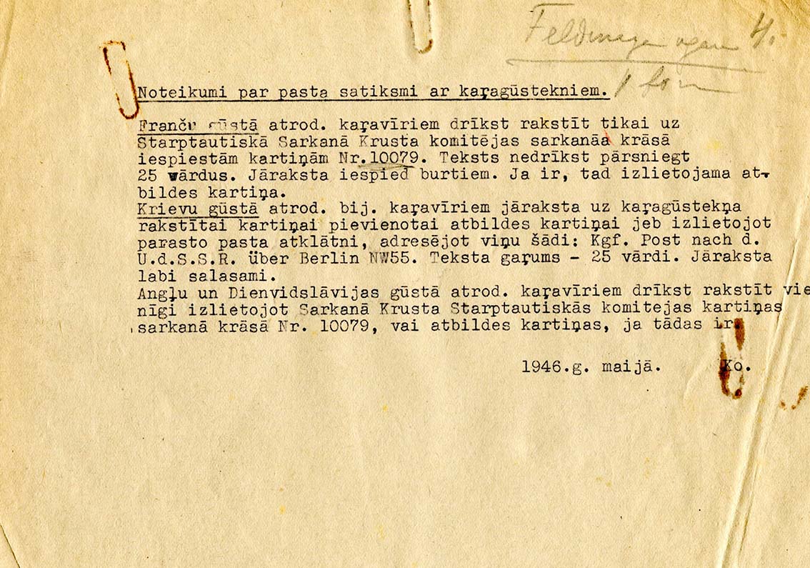 Noteikumi par pasta sūtījumiem karagūstekņiem. 1946. gada maijs.