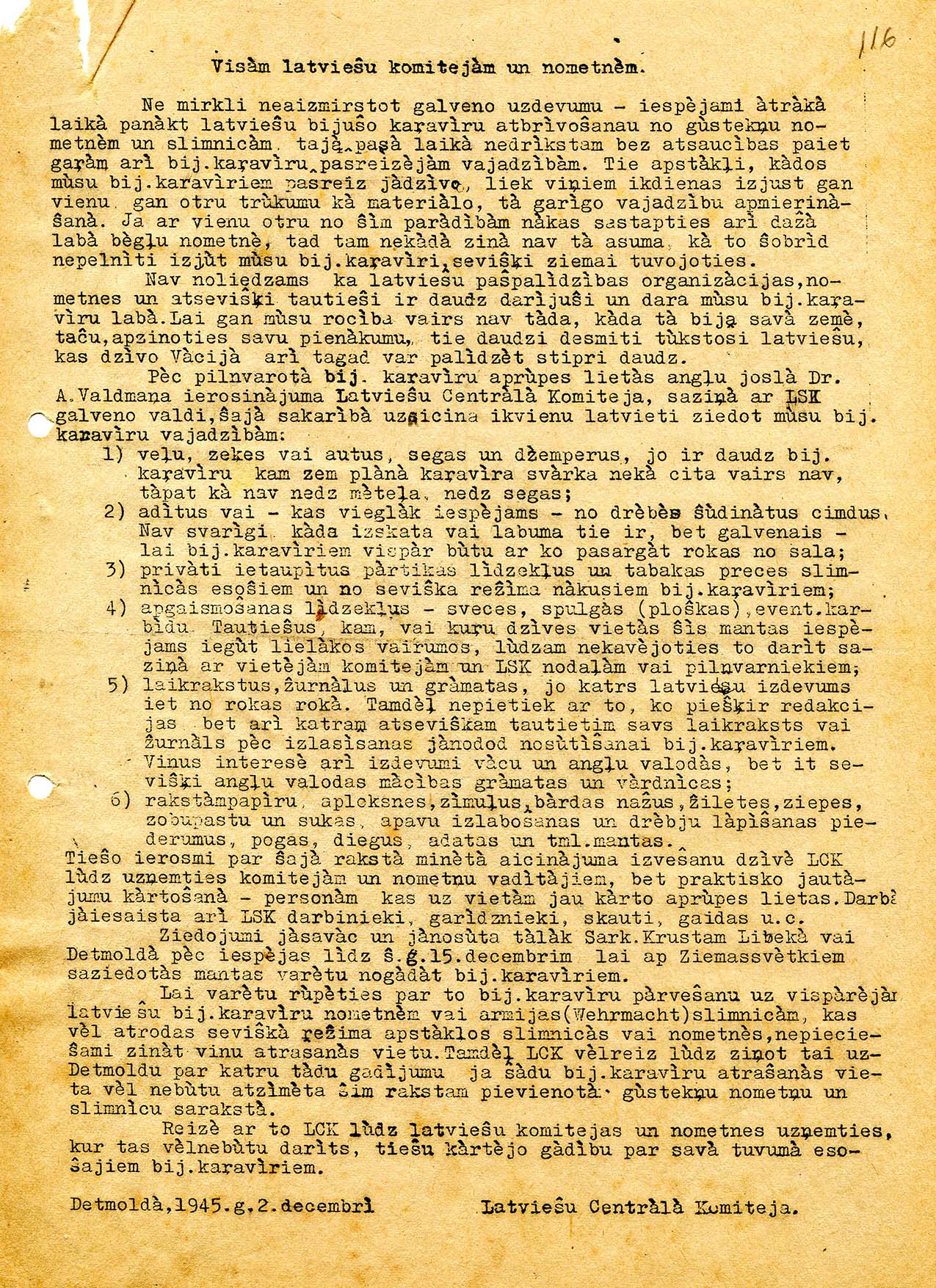 Latviešu Centrālās komitejas informācija par latviešu bijušo karavīru atbrīvošanu. 1945. gada 2. decembris.