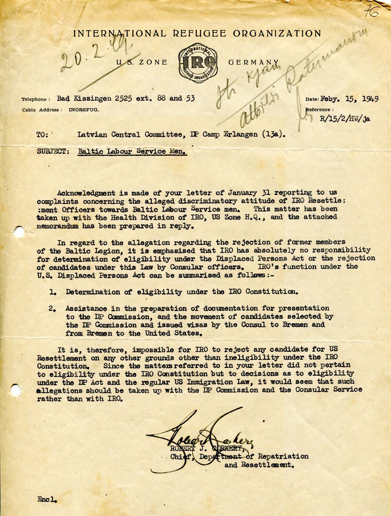 IRO vēstule par Baltiešu darba dienestu. 1949. gada 15. februāris.