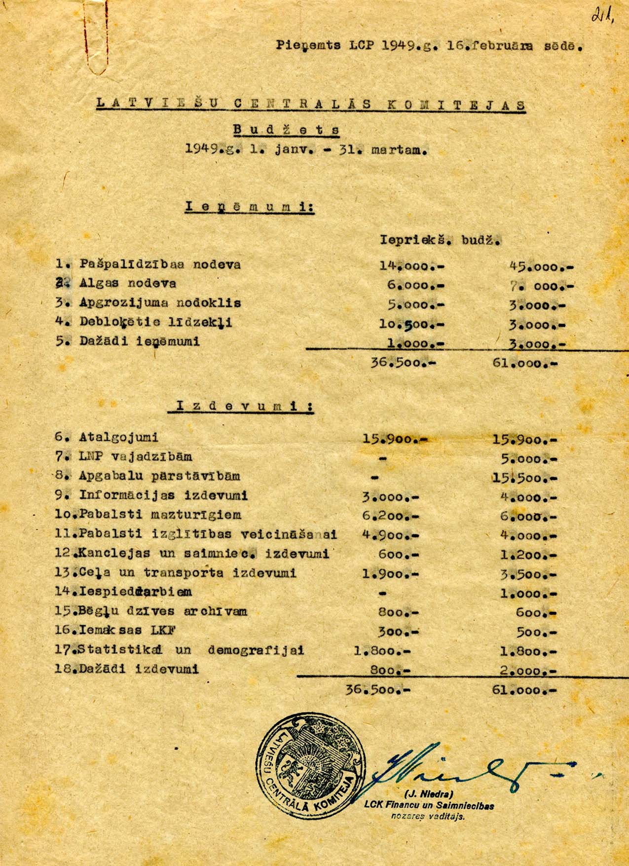 | Latviešu Centrālās Komitejas budžets. 1949. gads. LVA, 1971. f., 1. apr., 2. l., 21. lp. |