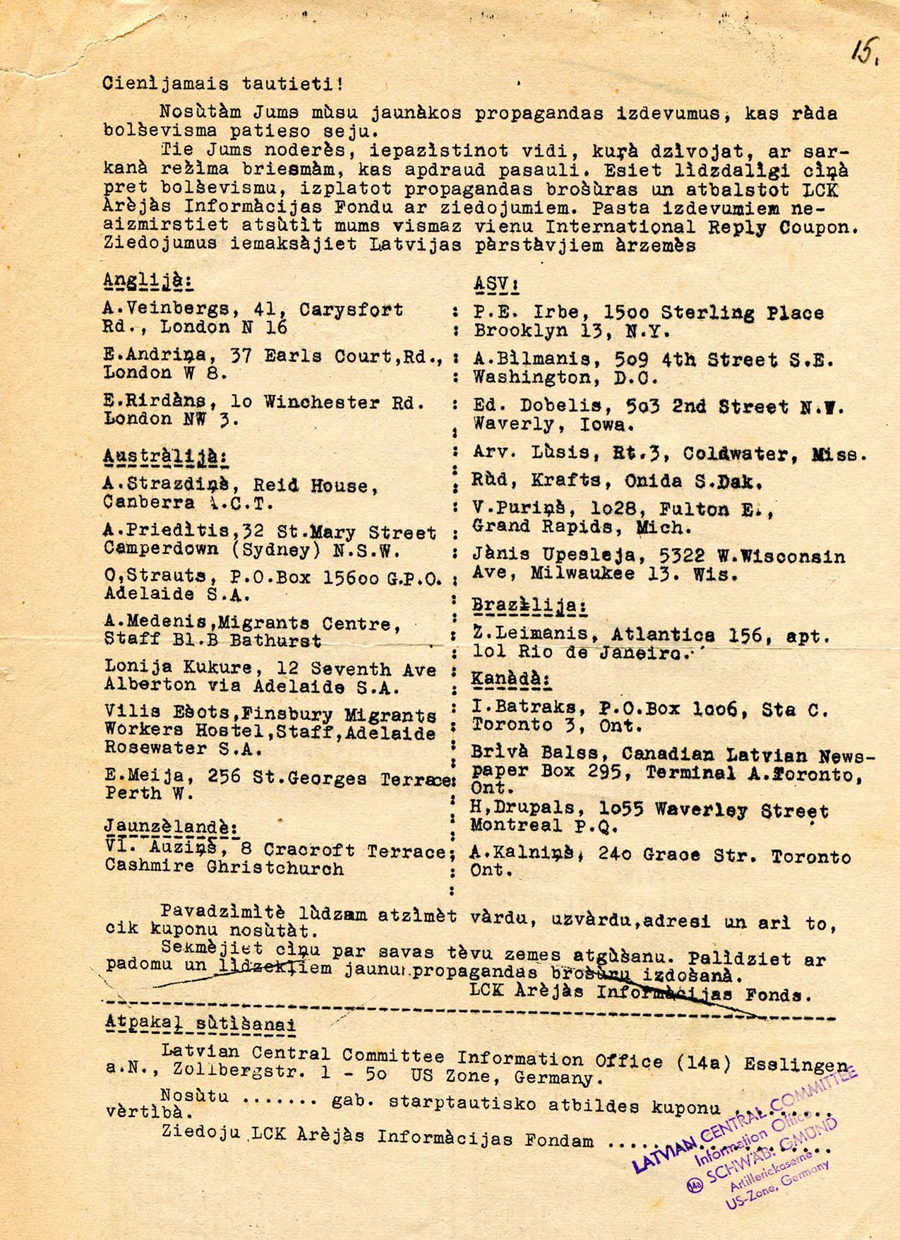 | Latviešu Centrālās komitejas Ārējās informācijas fonda apkārtraksts. LVA, 1971. f., 1. apr., 7. l., 15. lp. |