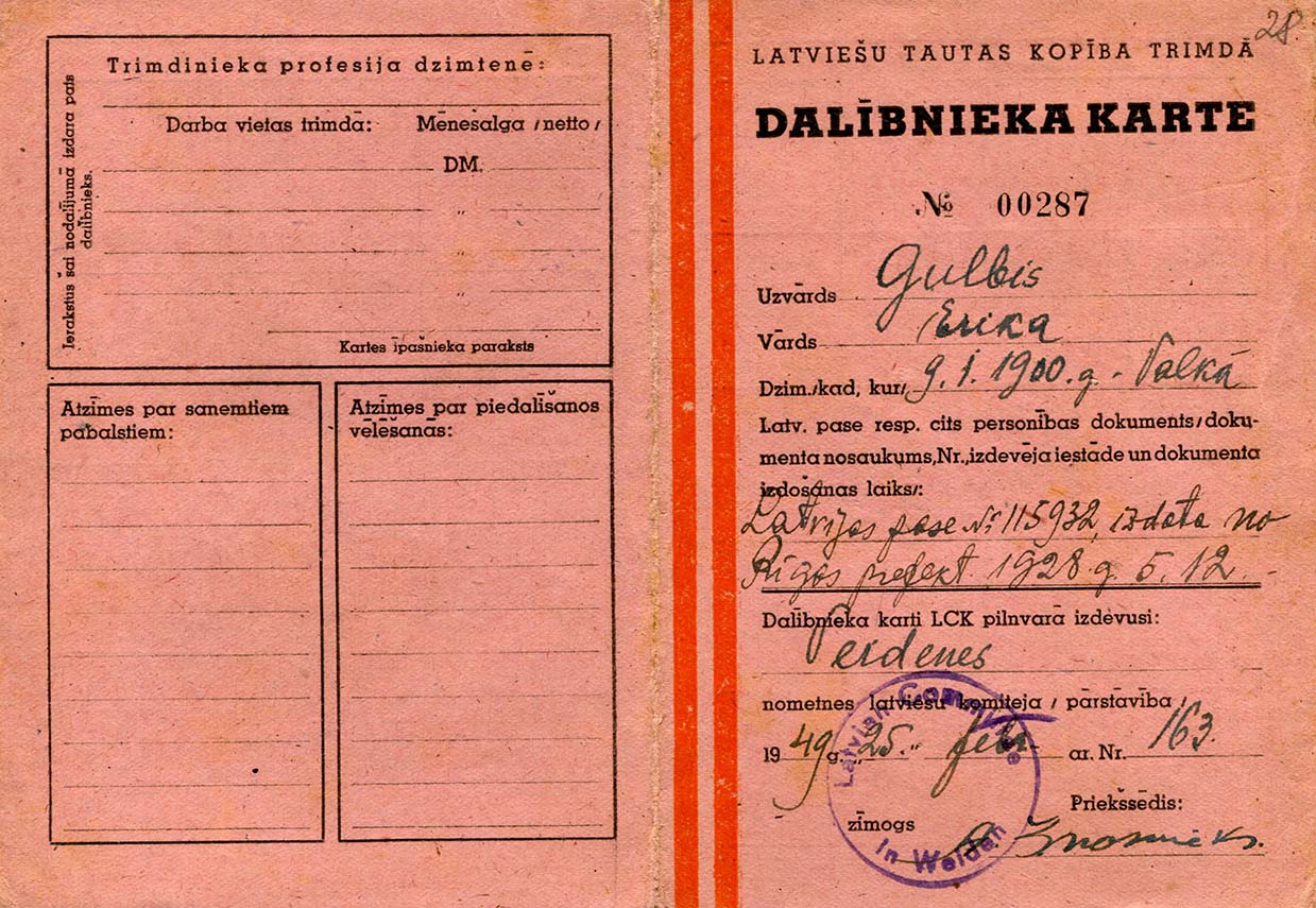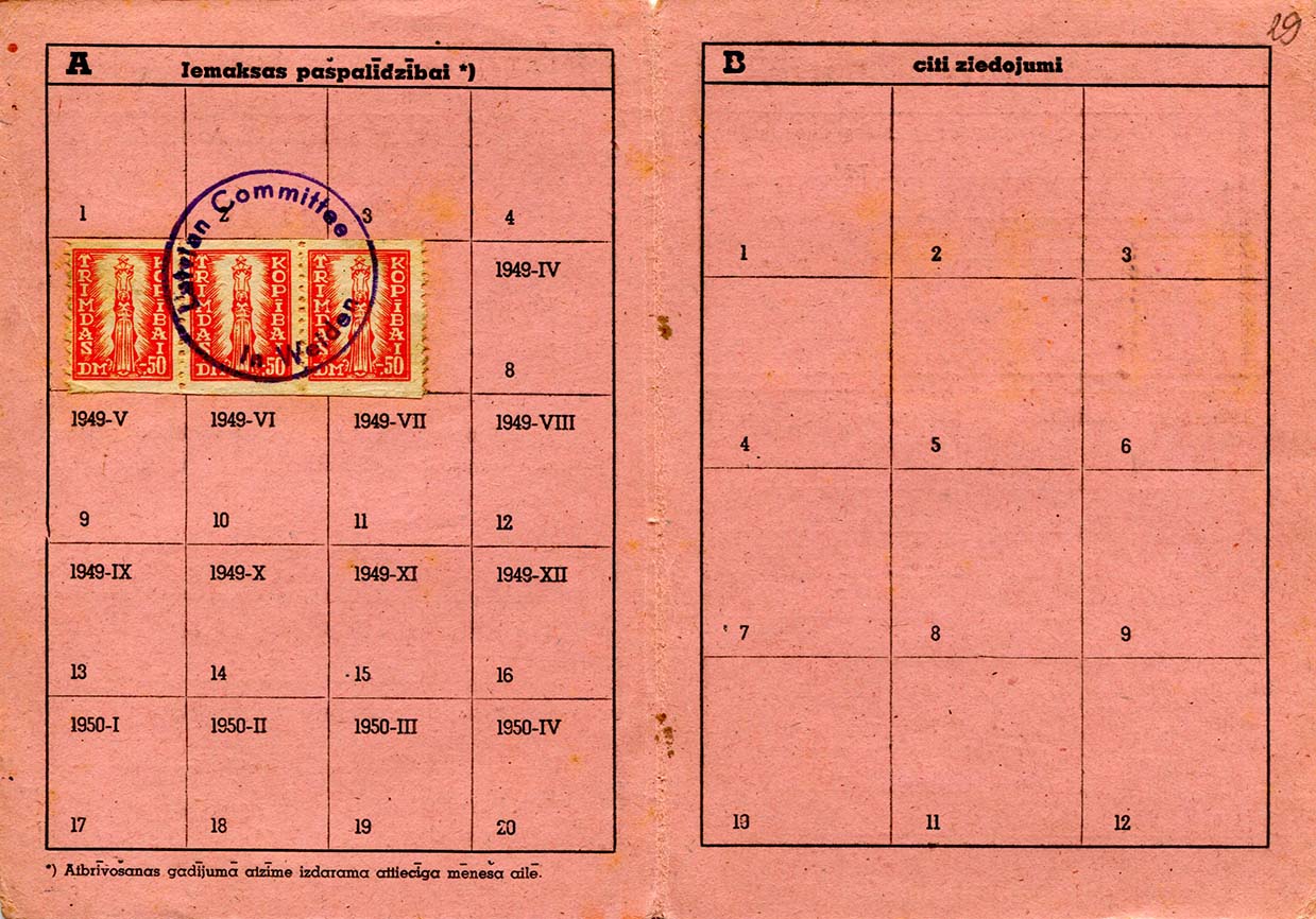 | Latviešu tautas kopības trimdā dalībnieka karte. 1949. gads. LVA, 2250. f., 2v. apr., 6. l., 28., 29. lp. |