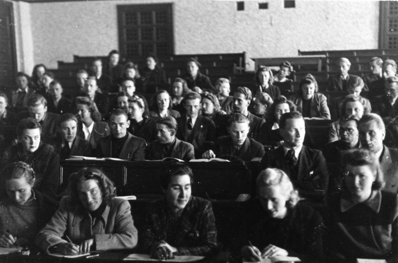 | Tudengid loengusaalis Balti Ülikoolis, arvatavasti 1946. aastal. VEMU FK.61-21 |