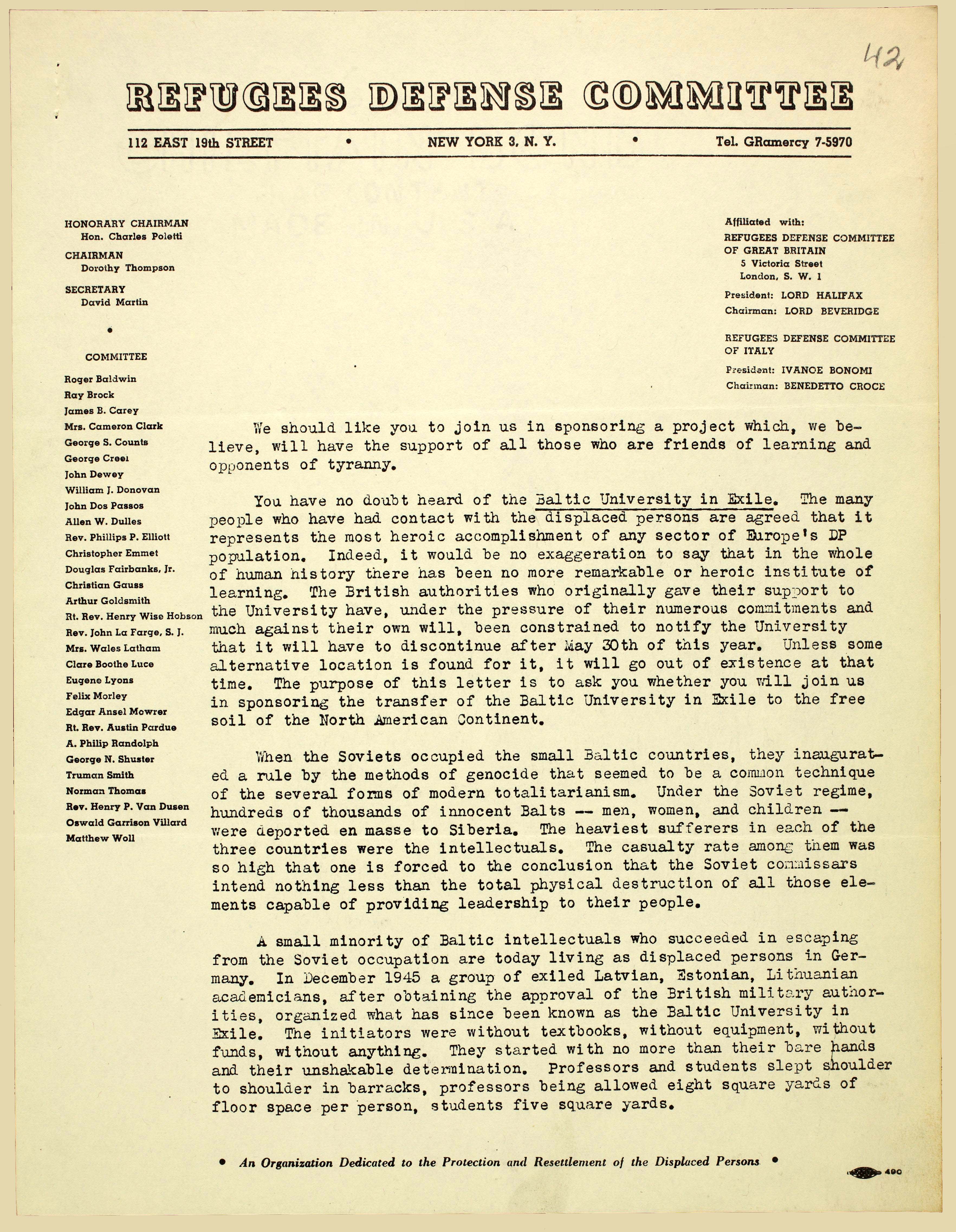 | Põgenike Kaitsekomitee pöördumine Balti Ülikooli tegevuse rahastajate leidmiseks. ERA.1608.2.949, lk 42–43 (digiteeritud, www.ra.ee/saaga) |
