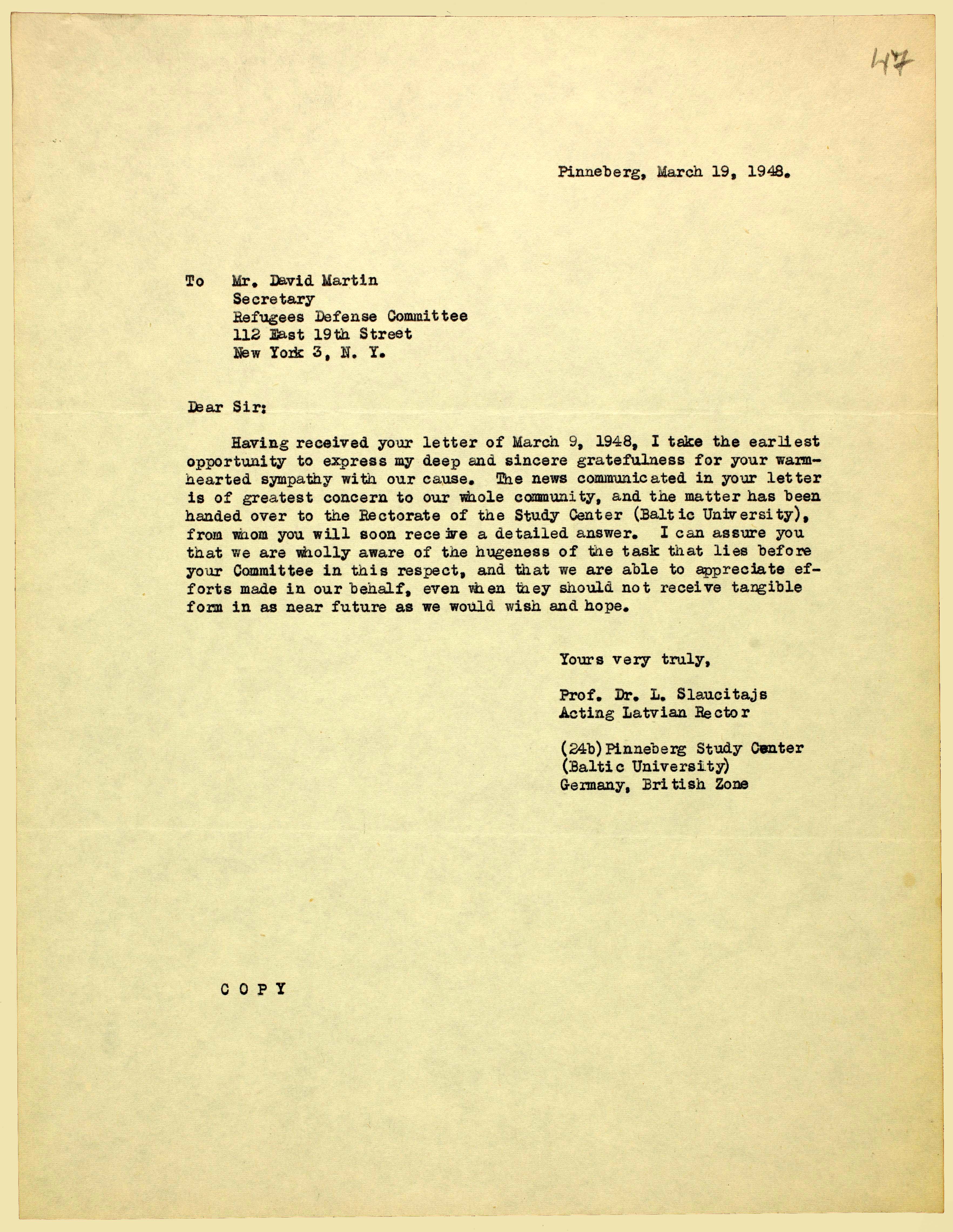 | Balti Ülikooli läti rektori Dr. L. Slaucitajse tänukiri Põgenike Kaitsekomiteele osutatud abi eest. 19. märts 1948, Pinneberg. ERA.1608.2.949, lk 47 (digiteeritud, www.ra.ee/saaga) |