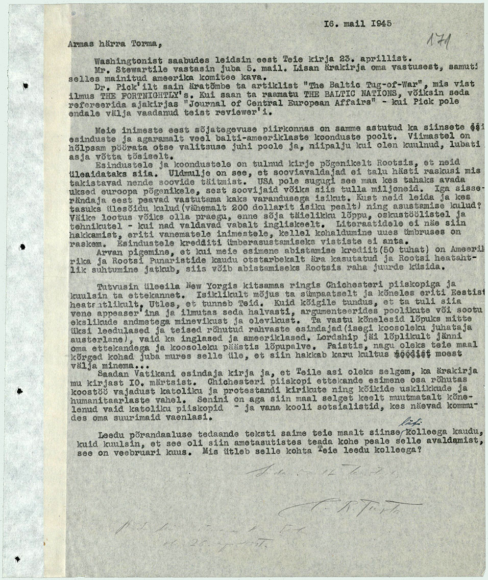 Karl Robert Pusta refereerib kirjas August Tormale Ameerika Ühendriikidesse sisserändamise tingimusi 1945. aastal.