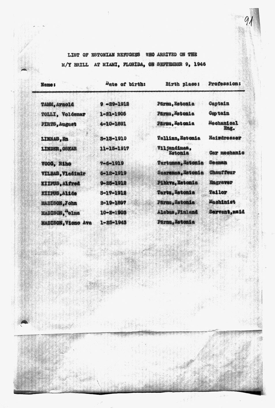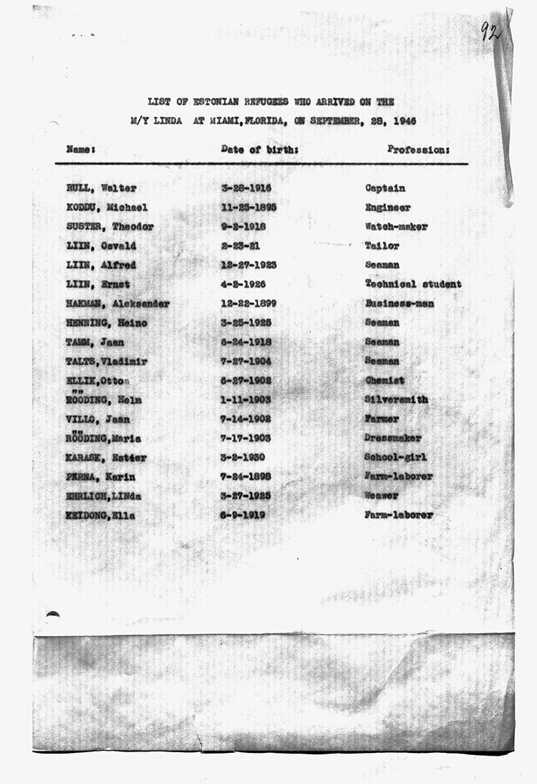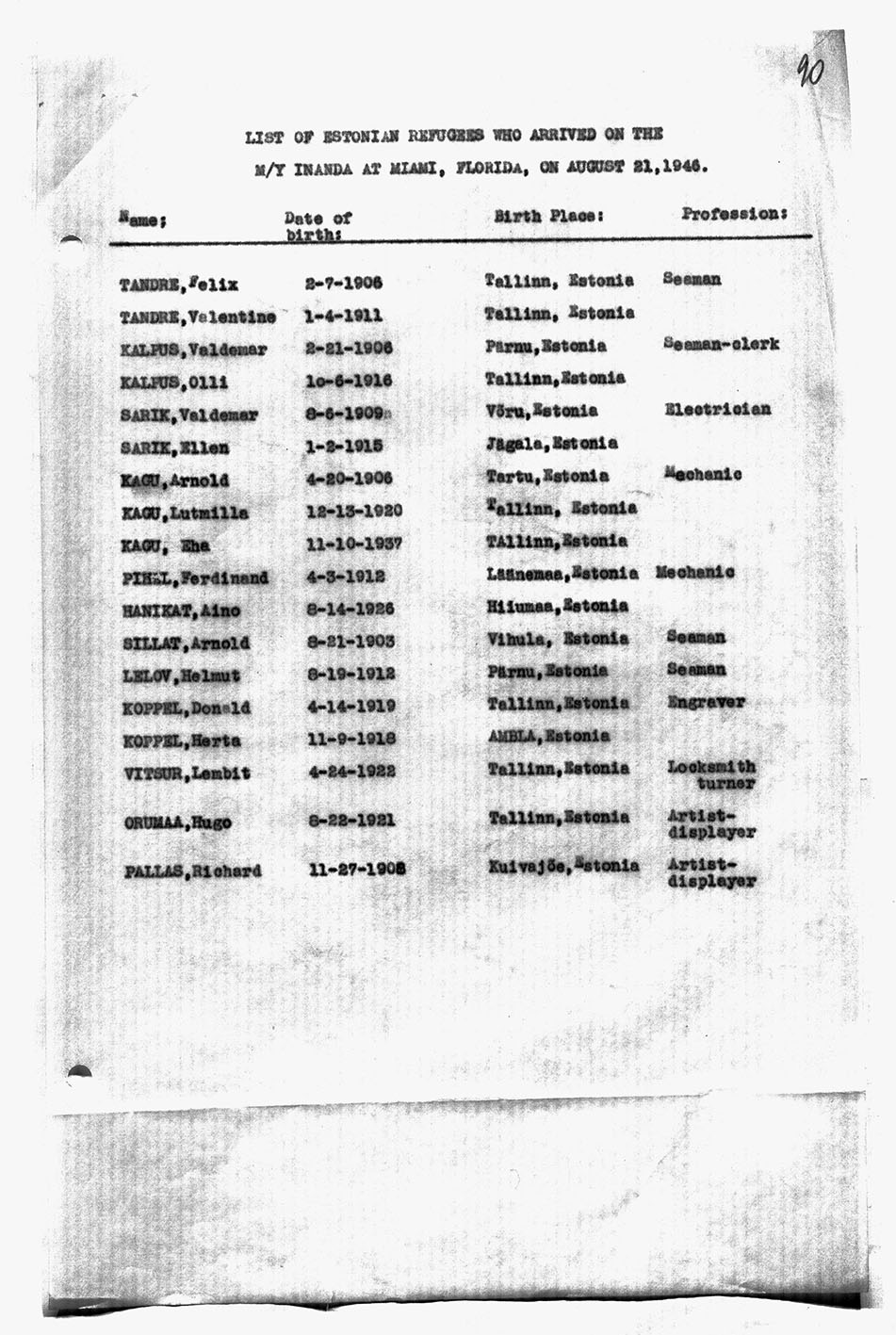 1946. aasta augustis ja septembris paatidega Rootsist Miamisse jõudnud eestlaste nimekirjad.