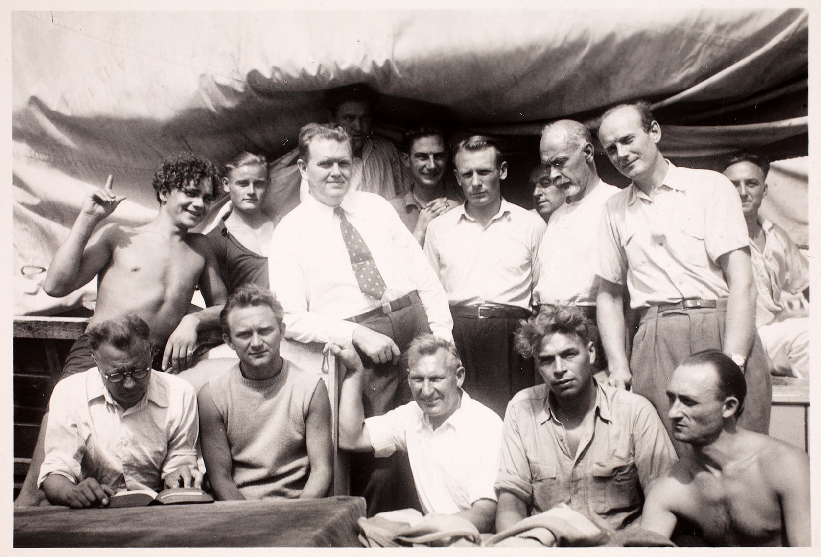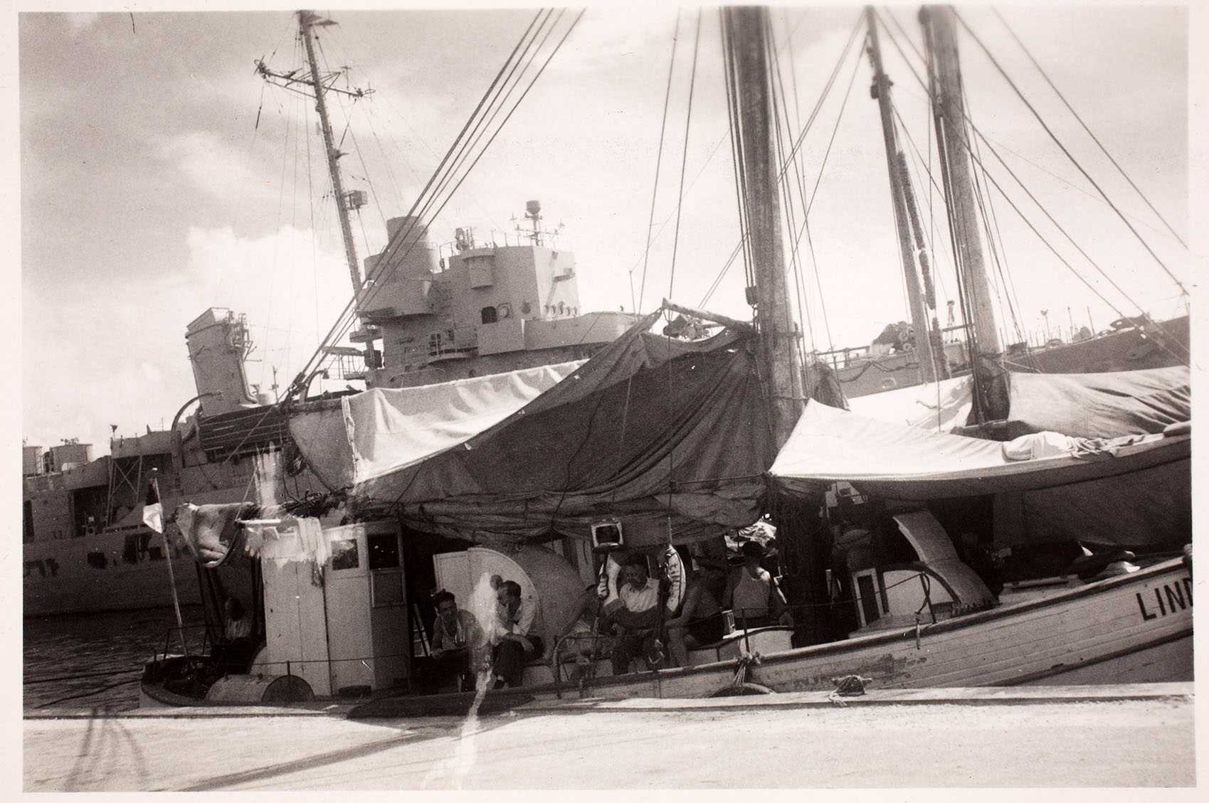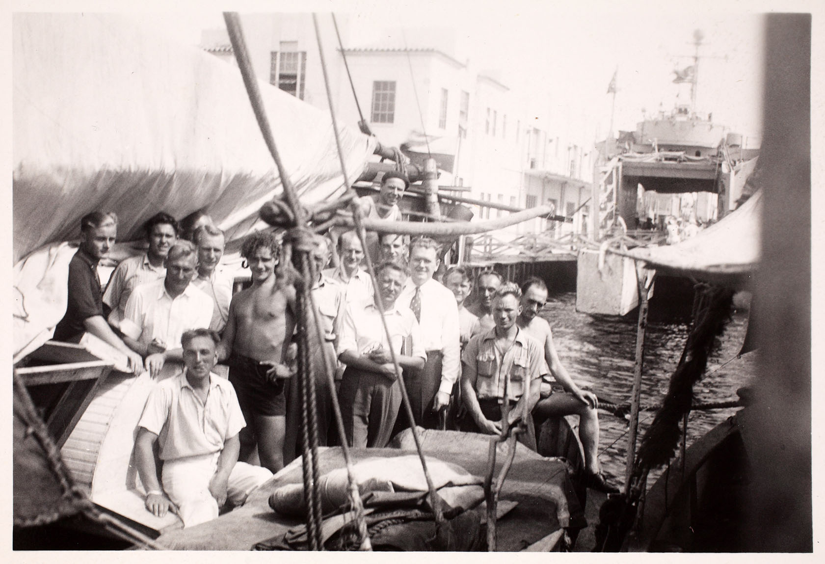 Mootorlaev “Linda” ja Ameerika Ühendriikidesse saabunud eesti pagulased, grupifotol lipsuga Ernst Jaakson. Miami, 18. oktoober 1946.
