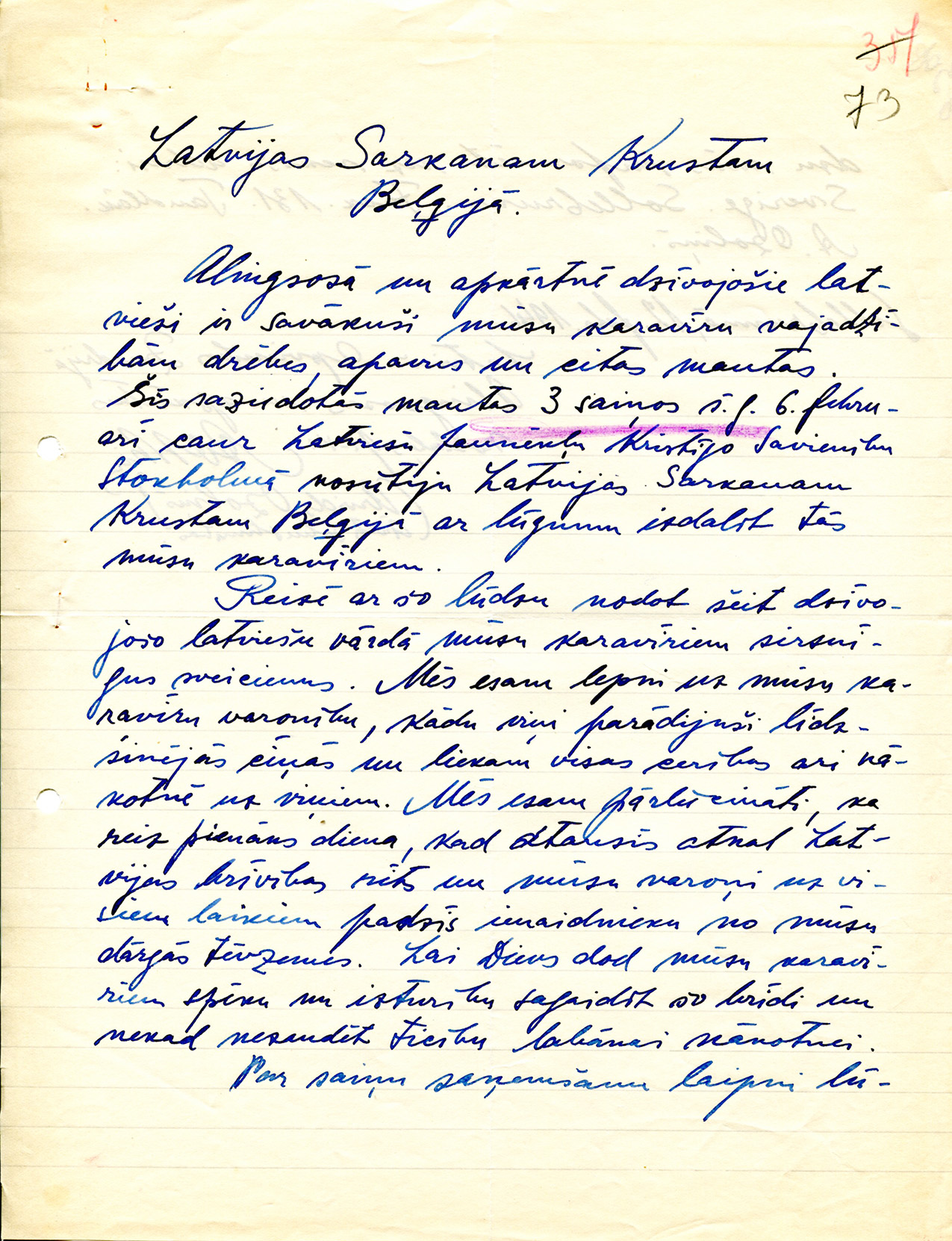 | Latviešu apvienības Zviedrijā vēstule Latvijas Sarkanajam krustam Beļģijā. 1946. gada 12. februāris. LVA, 2176. f., 2v. apr., 206. l., 73., 73. o.p. lp. |