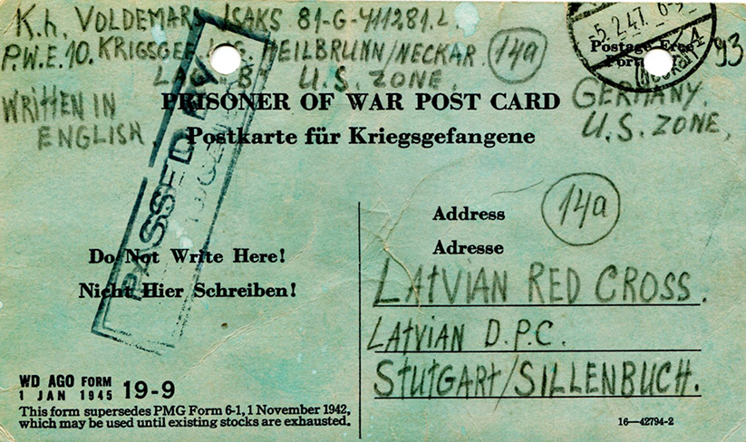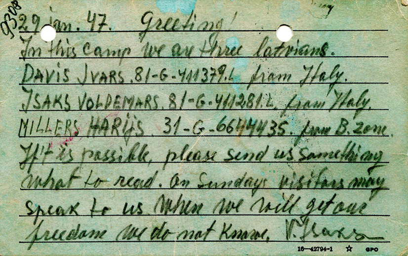 | Karagūstekņa pastkarte. 1947. gads. LVA, 2176. f., 2v. apr., 20. l., 93., 93. o.p. lp. |