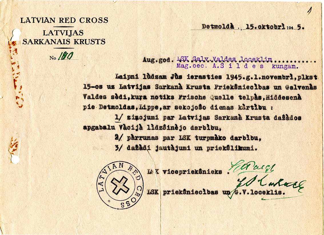 | Uzaicinājums piedalīties Latvijas Sarkanā krusta valdes sēdē. 1945. gada 15. oktobris. LVA, 2176. f., 2v. apr., 20. l., 206. lp. |