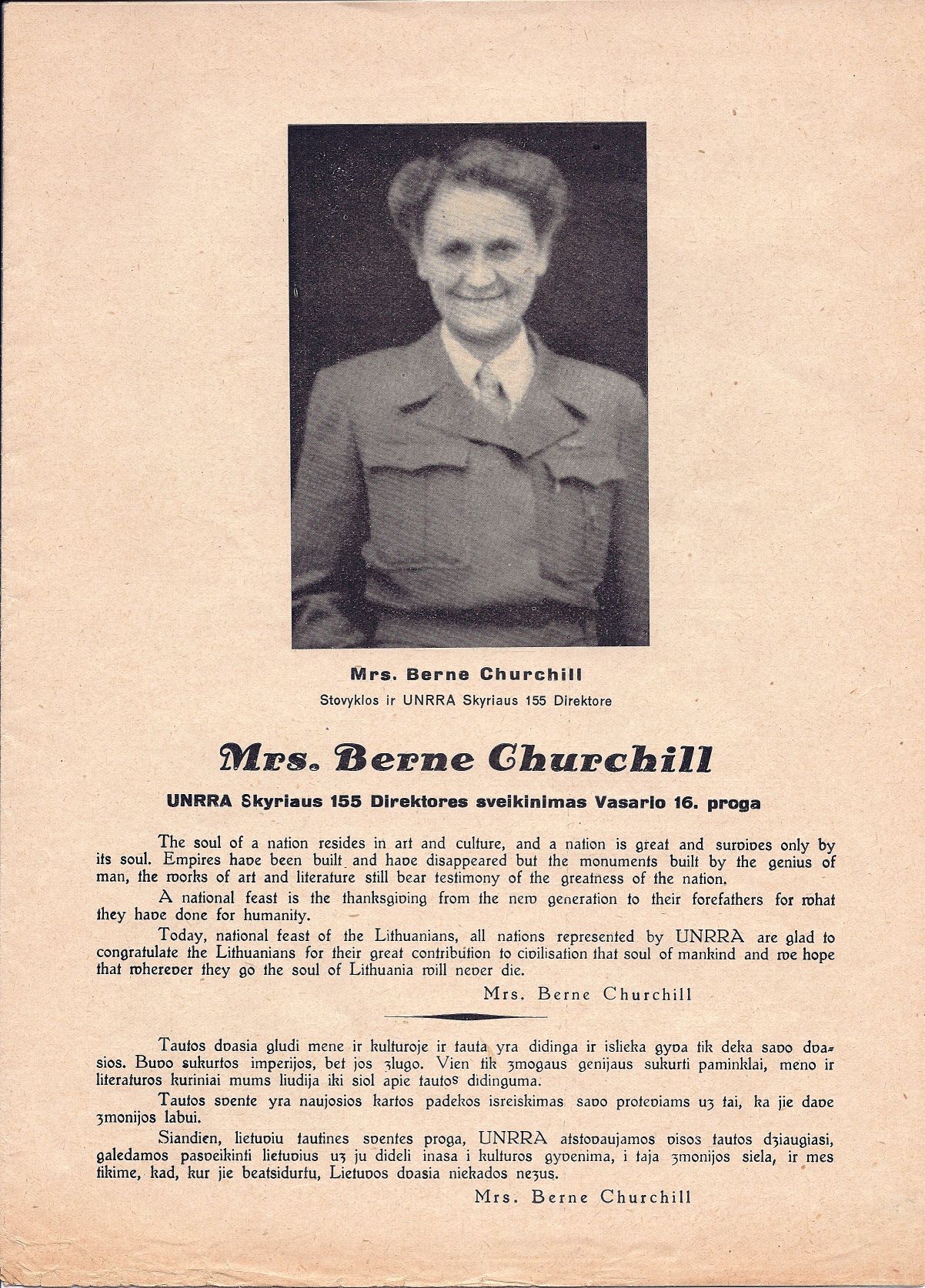 | UNRRA 155 skyriaus direktorės Berne Churchill sveikinimas Vasario 16-osios proga, 1946 m., ALKA |