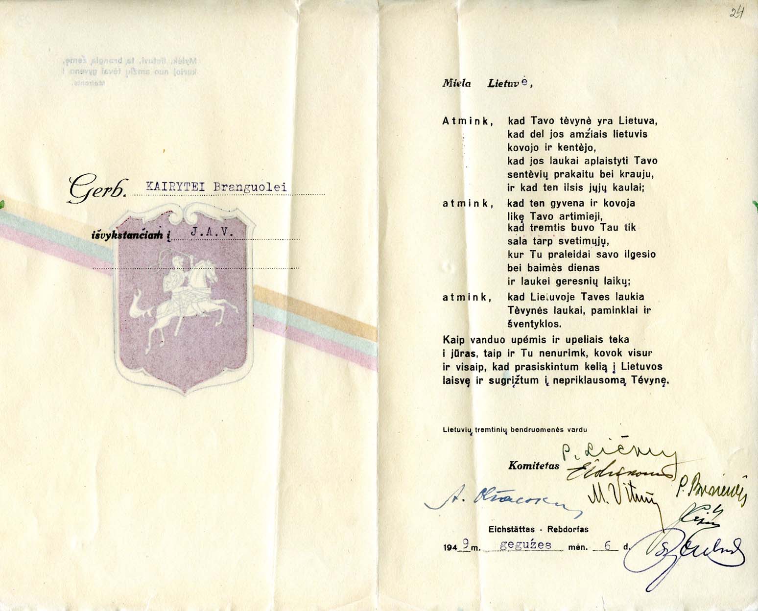 | Lietuvių tremtinių draugijos atmintinė asmeniui, paliekančiam DP, LNB RKRS F28:63 |