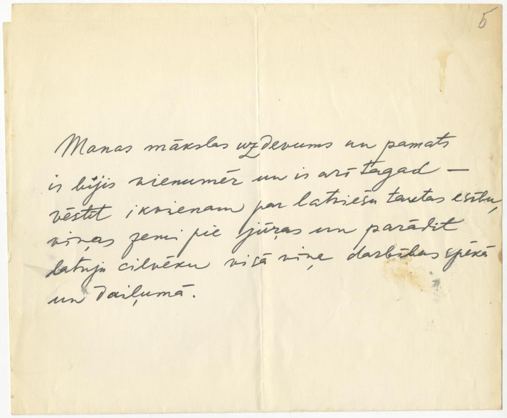 Kā savu mākslas moto formulējis pats mākslinieks: “Manas mākslas uzdevums un pamats ir bijis vienumēr un ir arī tagad – vēstīt ikvienam par latviešu tautas esību, viņas zemi pie jūŗas un parādīt latvju cilvēku visā viņa darbības spēkā un daiļumā.”