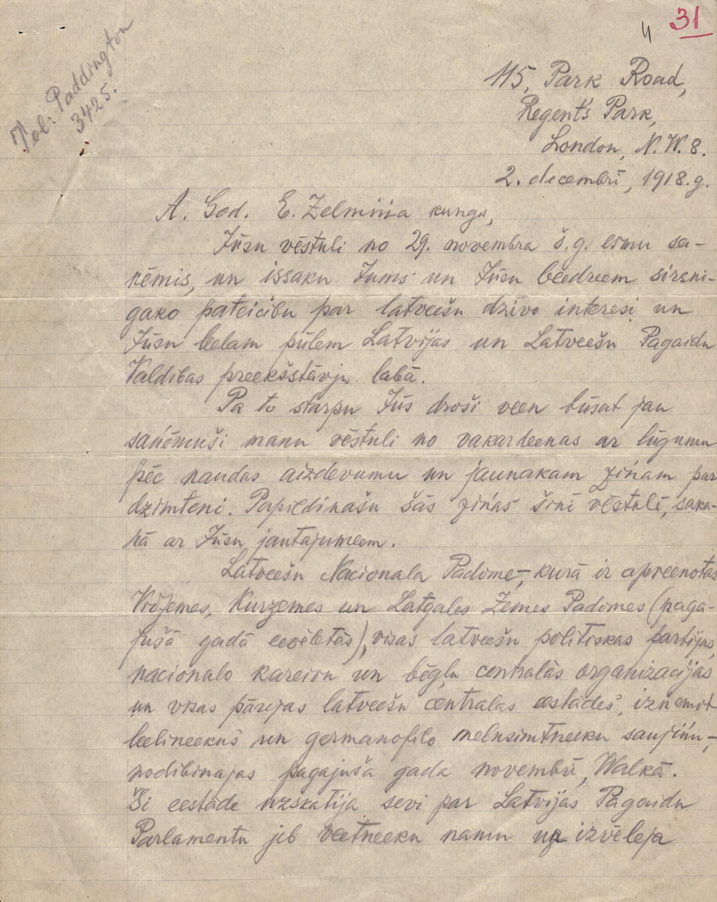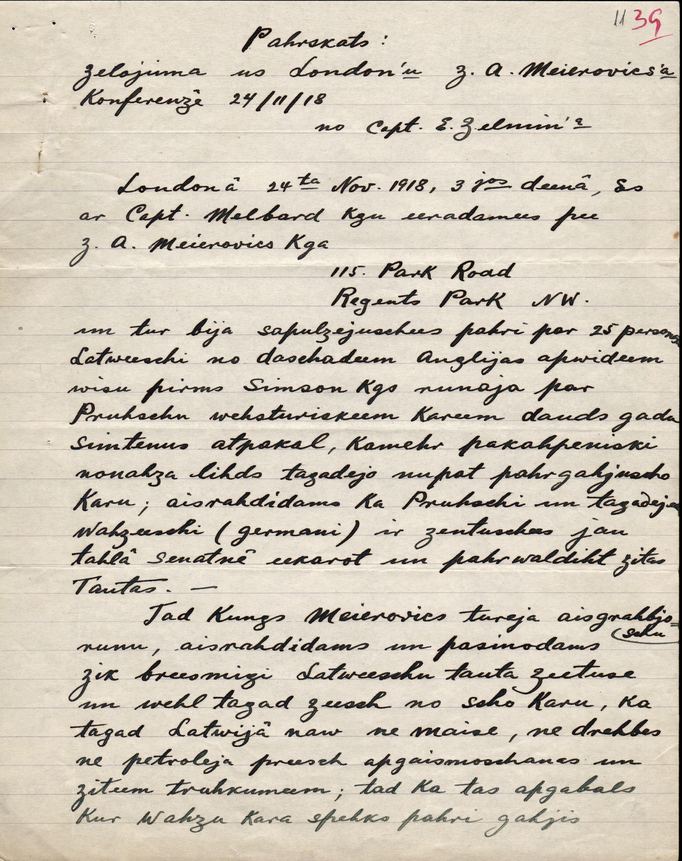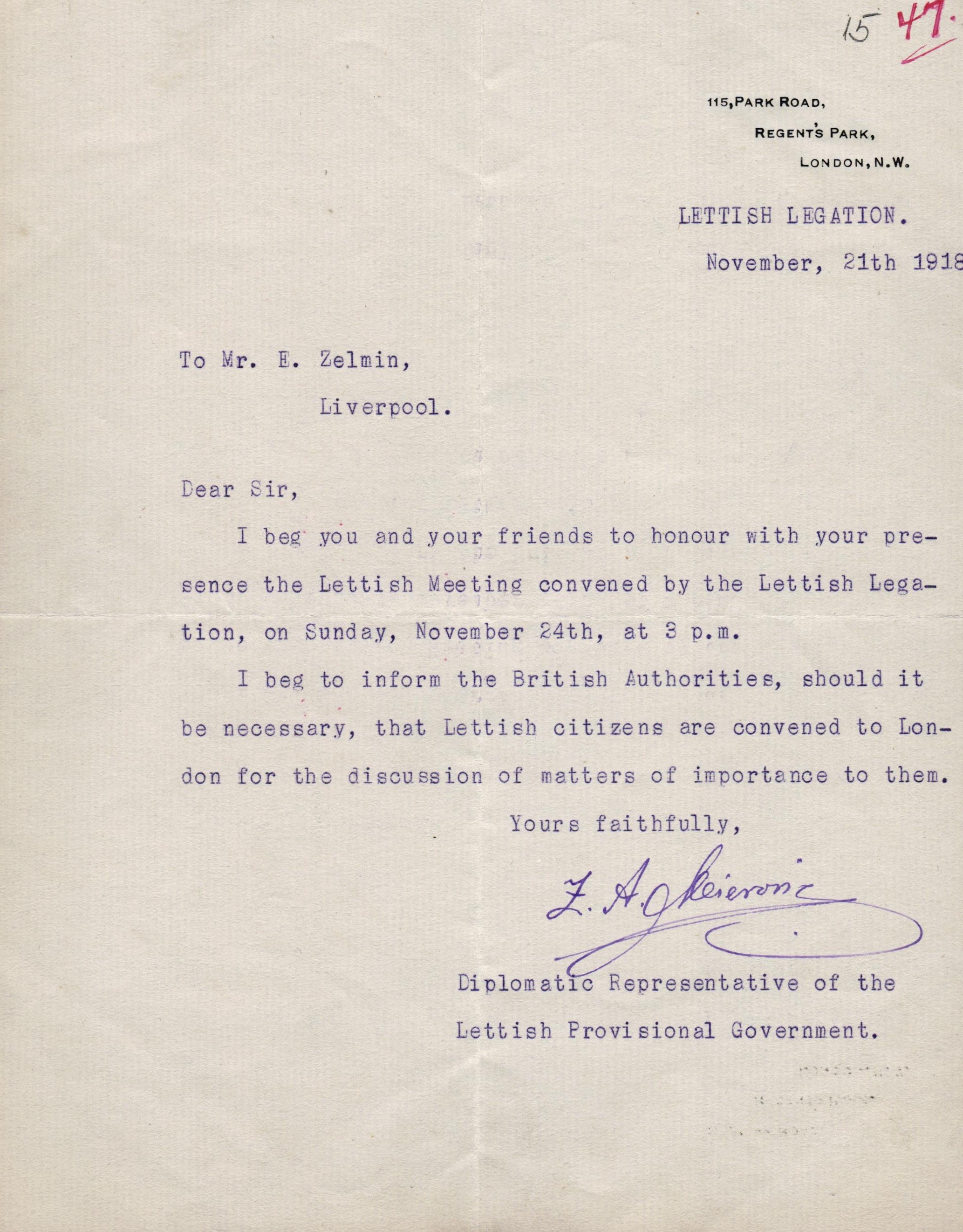 1918.gada 11. novembrī Lielbritānijas ārlietu ministrs Artūrs Balfūrs atzina LPNP par Latvijas "de facto" valdību. Šīs atzīšanas norakstu var aplūkot E.Celmiņa dokumentu klāstā. 1918.gada 24.novembrī Londonā ar latviešu sabiedrību tikās Zigfrīds Anna Meierovics, viens no ietekmīgākajiem Latvijas Republikas valstsvīriem un diplomātiem. Šī notikuma apraksts arī aplūkojams E.Celmiņa dienasgrāmatā, kā arī E.Celmiņa un Z.A.Meierovica sarakste, arī par finansiāla atbalsta sniegšanu.