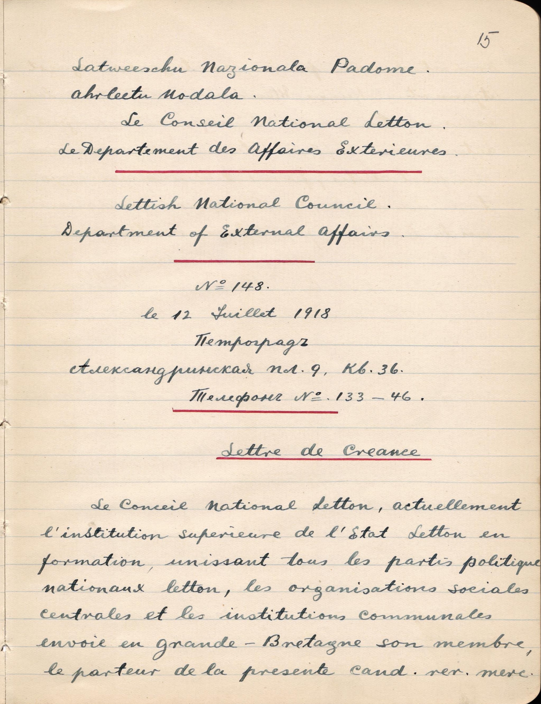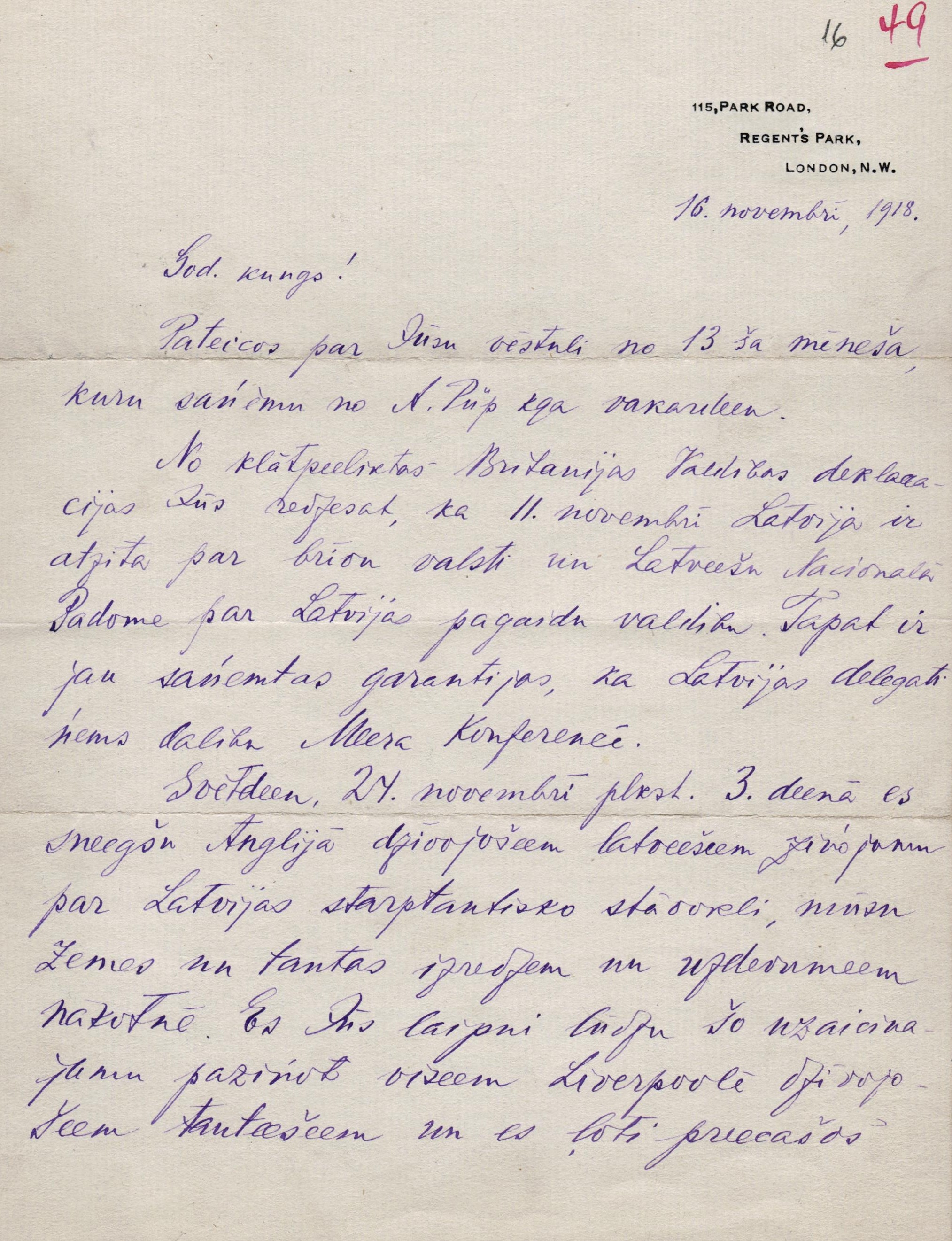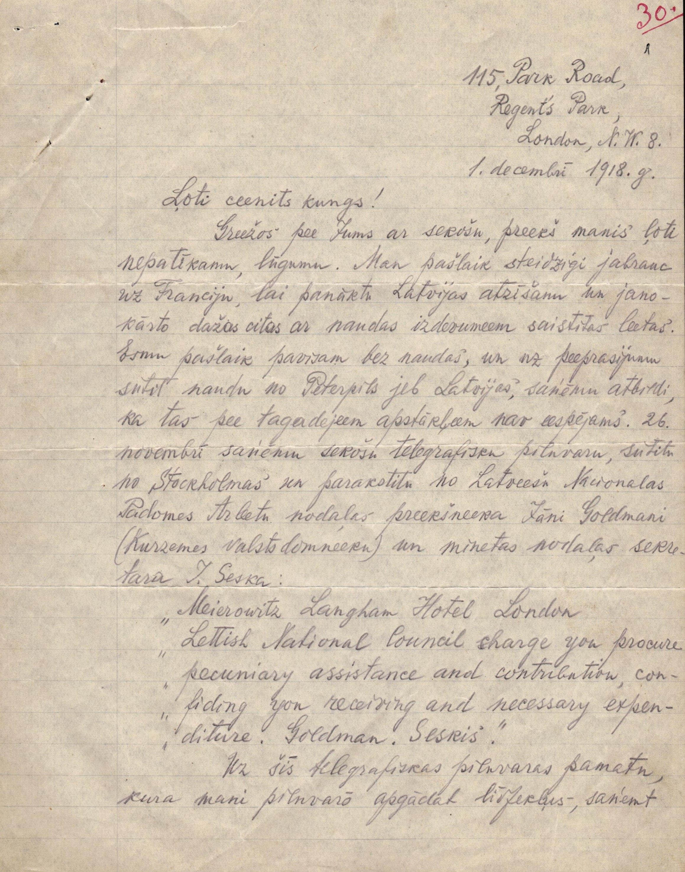 1918.gada 11. novembrī Lielbritānijas ārlietu ministrs Artūrs Balfūrs atzina LPNP par Latvijas "de facto" valdību. Šīs atzīšanas norakstu var aplūkot E.Celmiņa dokumentu klāstā. 1918.gada 24.novembrī Londonā ar latviešu sabiedrību tikās Zigfrīds Anna Meierovics, viens no ietekmīgākajiem Latvijas Republikas valstsvīriem un diplomātiem. Šī notikuma apraksts arī aplūkojams E.Celmiņa dienasgrāmatā, kā arī E.Celmiņa un Z.A.Meierovica sarakste, arī par finansiāla atbalsta sniegšanu.