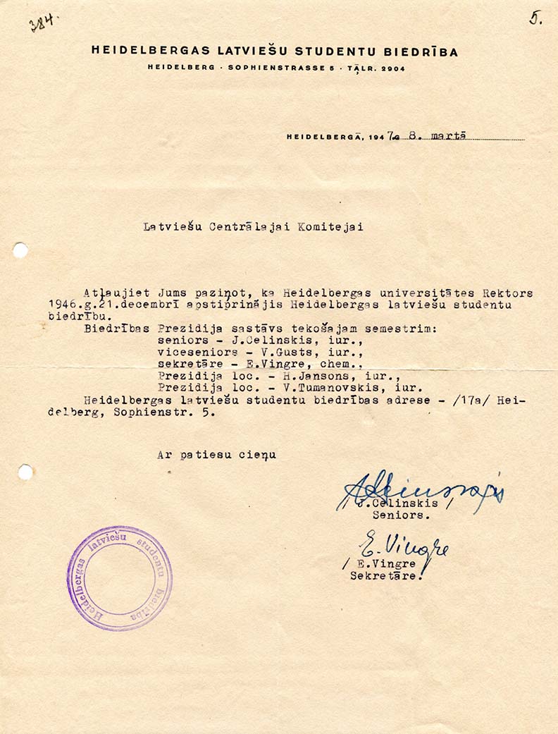 Organizācijas pamatdarbības dokumenti: biedrības statūti un darbības noteikumi, valdes sēžu protokoli. Sarakste ar dažādām sabiedriskām un juridiskām organizācijām pamatdarbības jautājumos. Materiāli par Vircburgas Universitātes vēsturi, pārskati par saimnieciskajiem jautājumiem un studentu skaitu; lūgumi, ziņojumi stipendiju un pabalstu jautājumā.