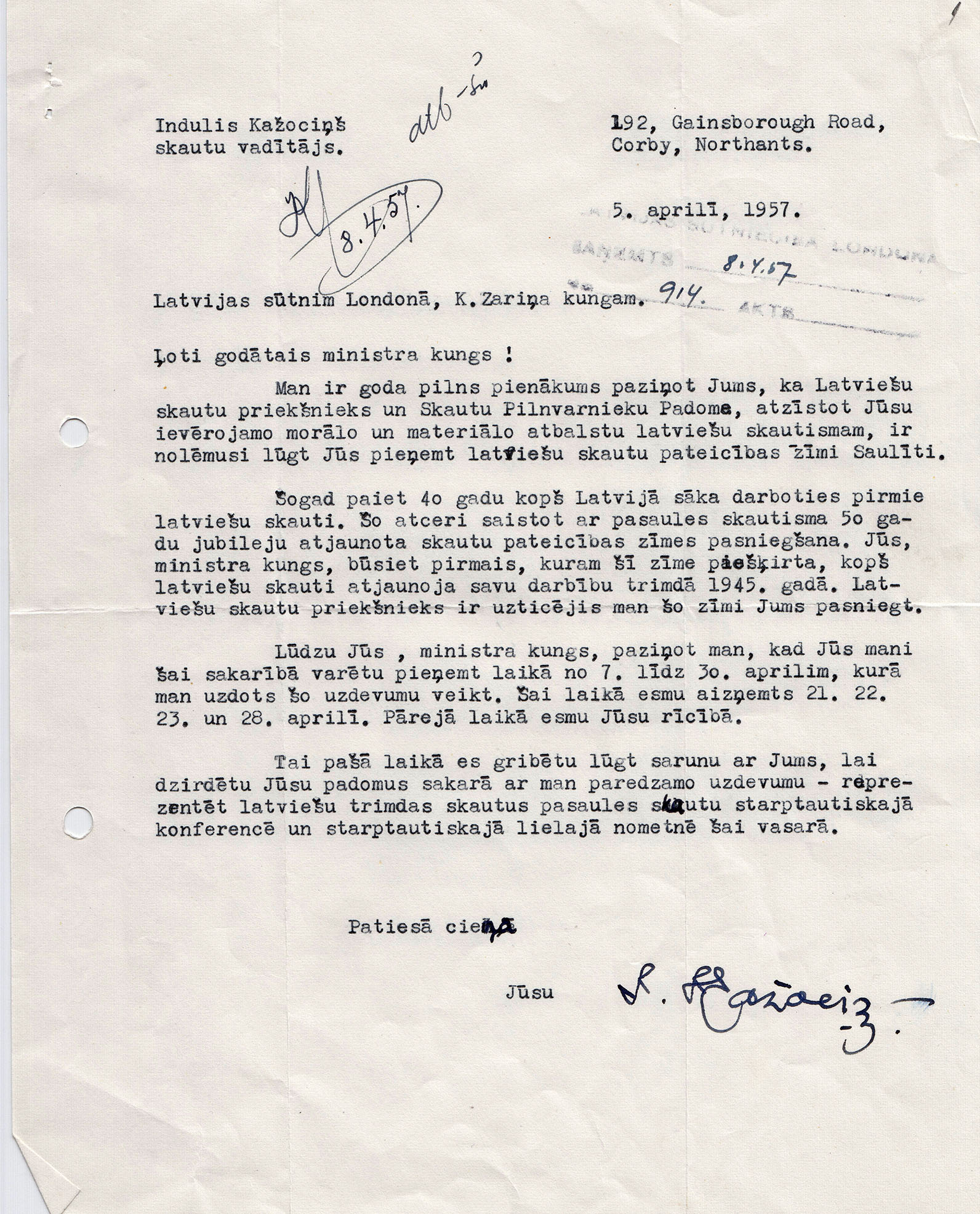 1957.gadā britu skauti gatavoja savu jubilejas džamboreju, lai atzīmētu skautisma 50 gadus. Latviešiem bija dota iespēja piedalīties ar 10 skautiem, 1 vadītāju un 1 pārstāvi Starptautiskā konferencē. Konferencē latviešus pārstāvēja I. Kažociņš. Kokneses vienība bija vienīgā, kas varēja piedalīties, bet tur bija tikai 7 zēni, tāpēc no Vācijas jendas palīgā ieradās vadītājs Pāvils Stūrāns ar trim Oldenburgas zēniem. Dalības maksu kopīgi sedza sūtņi K. Zariņš un A. Spekke, Komiteja Latvijas brīvībai, DVF valde un ģenerāļa Kārļa Goppera fonds. DVF Korbijas nodaļa dāvāja Latvijas karogu, ko svinīgā sarīkojumā 27. jūlijā iesvētīja mācītājs A. Dzenītis. Džamboreja notika no 1. līdz 13. augustam. Nometnes vārtus rotāja Korbijas daiļamatnieku darināti vairogi – Latvijas emblēmas. Līdzās citu tautu karogiem lepni plīvoja Latvijas karogs.